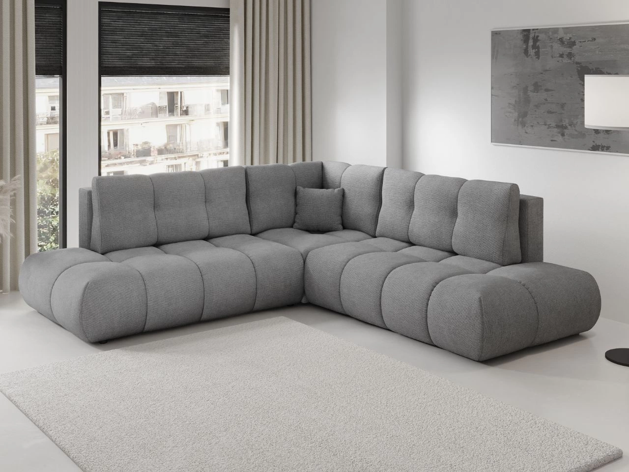 Narożnik Kair to nowoczesny i niezwykle komfortowy narożnik tapicerowany zaprojektowany z myślą o codziennym relaksie. Jego miękka, zaokrąglona forma oraz szerokie, głębokie siedziska tworzą wyjątkowo przytulną przestrzeń wypoczynkową, idealną do salonu. Tapicerka wykonana z tkaniny o wyraźnej, strukturalnej fakturze nadaje meblowi elegancki, ponadczasowy charakter i sprawia, że doskonale wpisuje się zarówno w aranżacje skandynawskie, jak i współczesne, minimalistyczne wnętrza.
