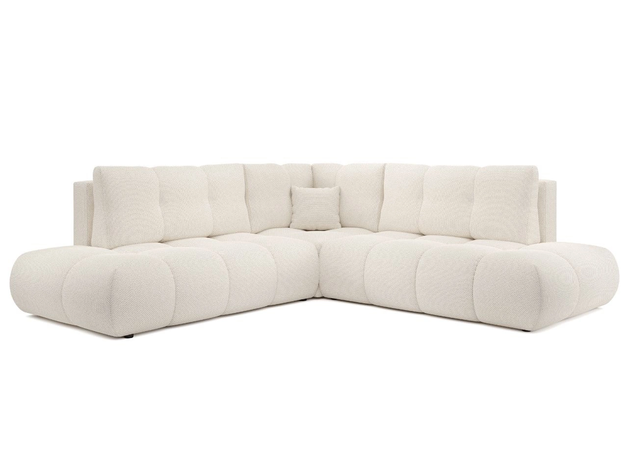 Siedzisko oparte na miękkim wypełnieniu zapewnia odpowiednią sprężystość i wysoki komfort nawet przy intensywnym użytkowaniu. Wysokie, profilowane oparcia oraz luźna poduszka dekoracyjna gwarantują wygodne podparcie pleców, sprzyjając długiemu wypoczynkowi. Kształt narożnika tworzy przestronną strefę relaksu, idealną do wspólnego spędzania czasu, oglądania filmów czy popołudniowego odpoczynku.
