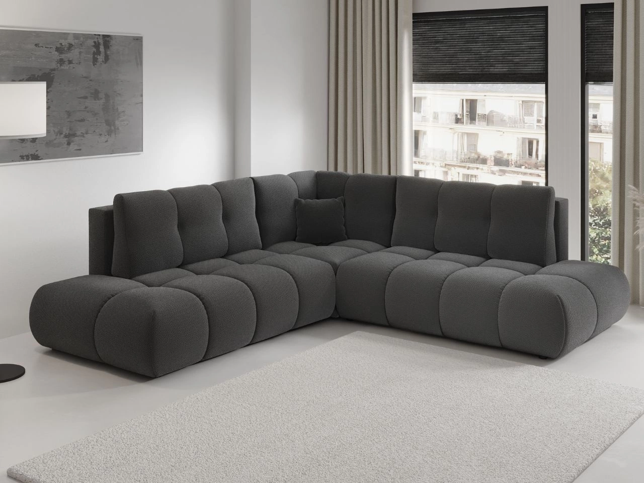 Narożnik Kair to nowoczesny i niezwykle komfortowy narożnik tapicerowany zaprojektowany z myślą o codziennym relaksie. Jego miękka, zaokrąglona forma oraz szerokie, głębokie siedziska tworzą wyjątkowo przytulną przestrzeń wypoczynkową, idealną do salonu. Tapicerka wykonana z tkaniny o wyraźnej, strukturalnej fakturze nadaje meblowi elegancki, ponadczasowy charakter i sprawia, że doskonale wpisuje się zarówno w aranżacje skandynawskie, jak i współczesne, minimalistyczne wnętrza.