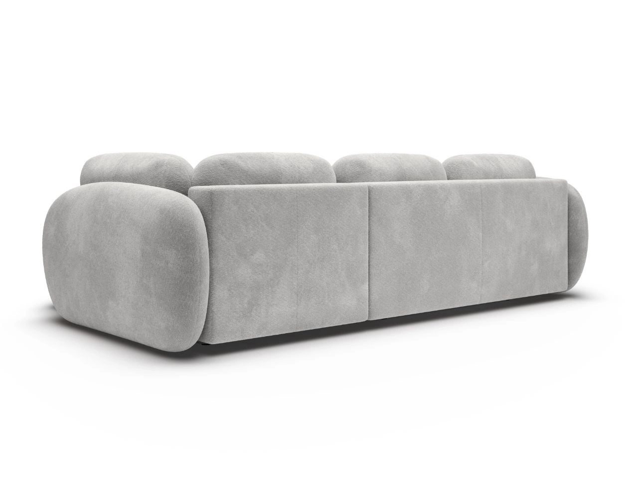 Narożnik posiada tapicerowane plecy, dzięki czemu można ustawić go nie tylko przy ścianie, ale także w centralnej części salonu – jako efektowny, wolnostojący element aranżacji. Całość dopełnia stabilna, niska podstawa, która podkreśla nowoczesny charakter bryły i dodaje jej lekkości mimo wyraźnie masywnej formy.