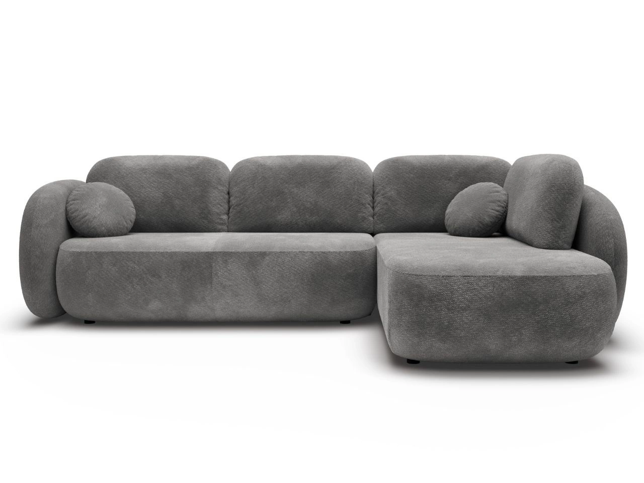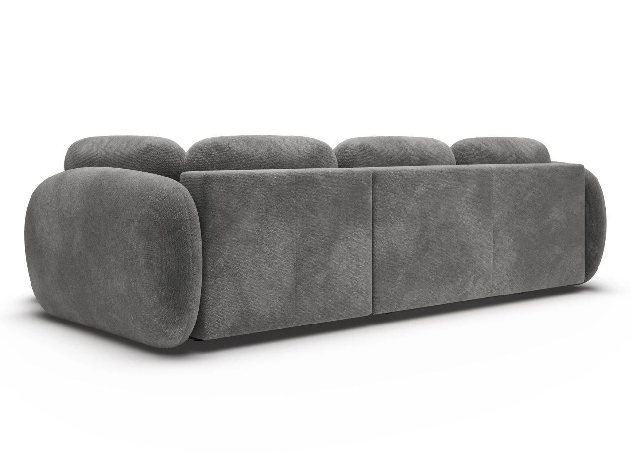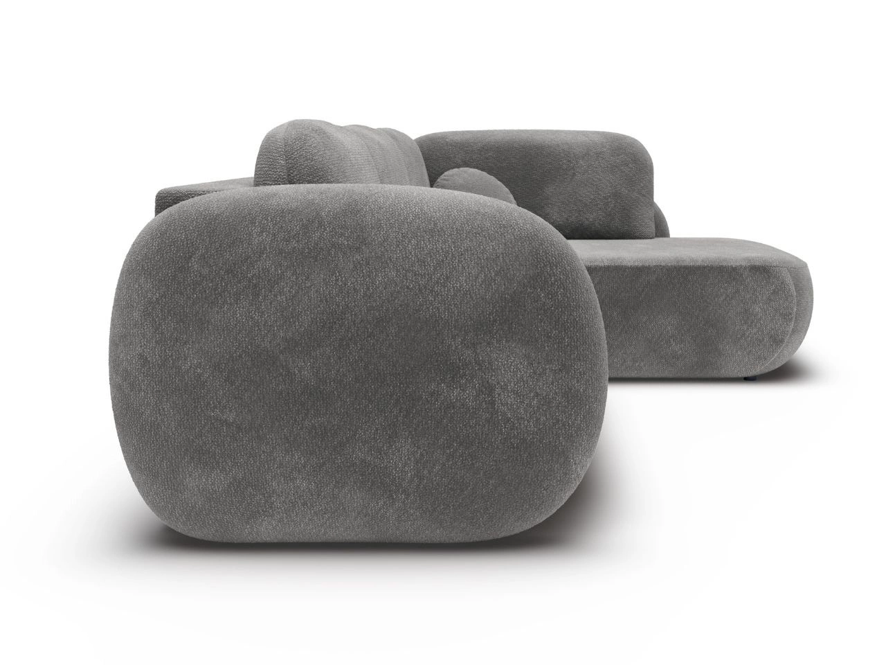 Narożnik posiada tapicerowane plecy, dzięki czemu można ustawić go nie tylko przy ścianie, ale także w centralnej części salonu – jako efektowny, wolnostojący element aranżacji. Całość dopełnia stabilna, niska podstawa, która podkreśla nowoczesny charakter bryły i dodaje jej lekkości mimo wyraźnie masywnej formy.