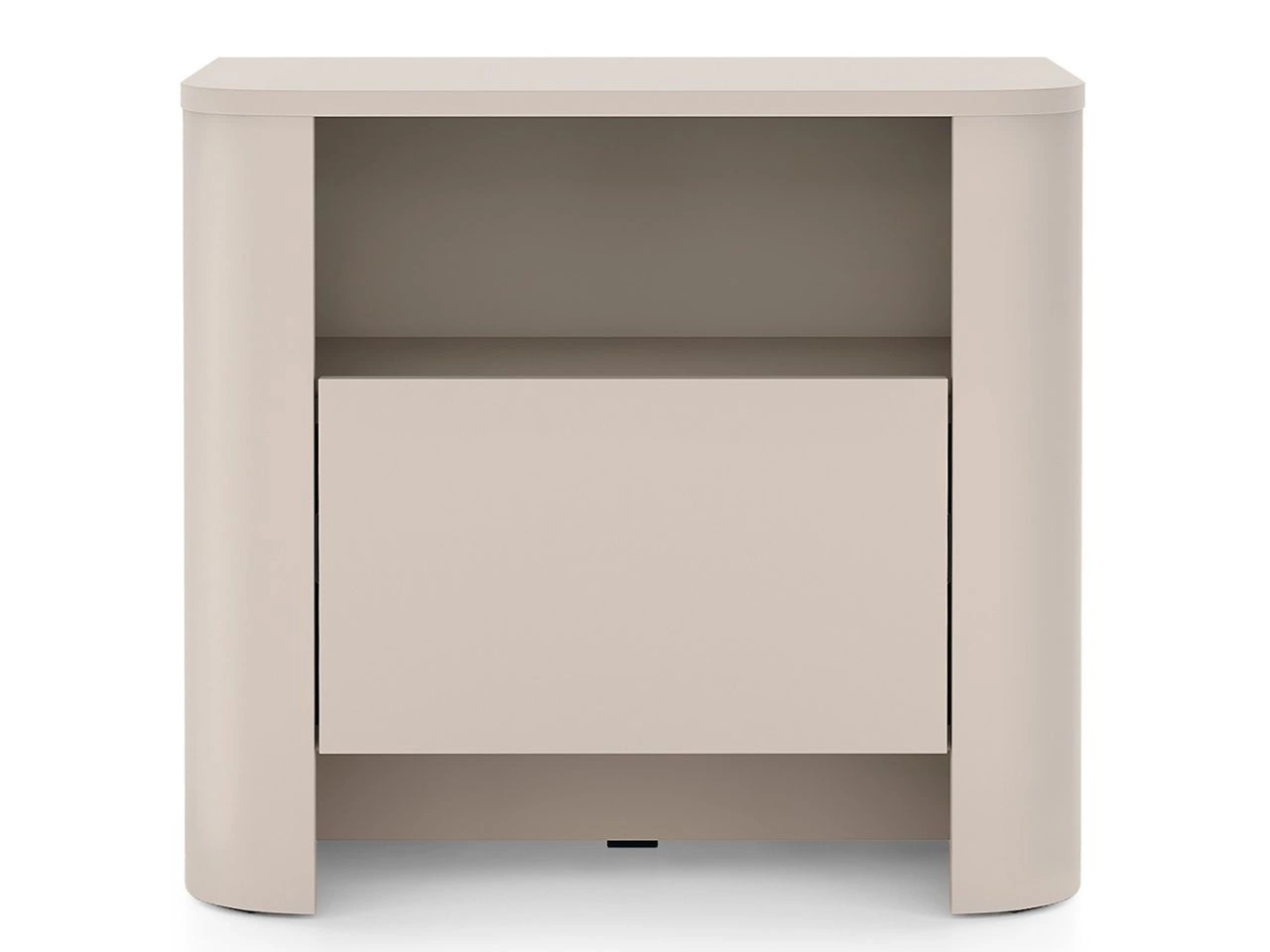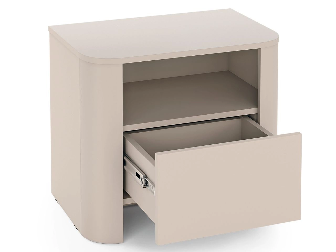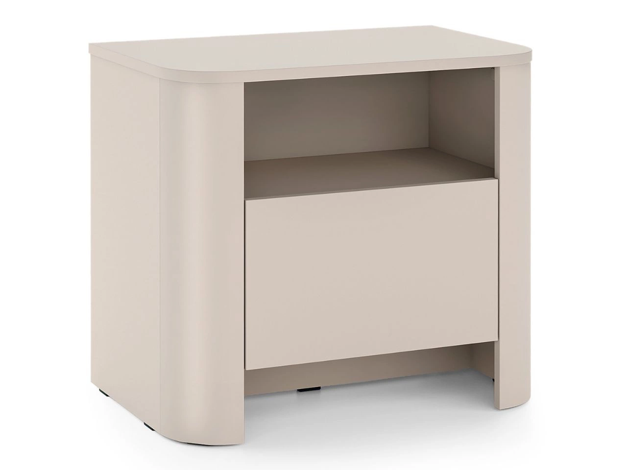 Utrzymany w modnym, ciepłym kolorze kaszmiru, szafka nocna do sypialni wnosi do wnętrza przytulność i subtelną elegancję. Delikatnie zaokrąglony korpus charakterystyczny dla całej kolekcji nadaje mu wyjątkowy, miękki wygląd. Korpus wykonany z płyty laminowanej i MDF oraz front z płyty laminowanej gwarantują trwałość i odporność na codzienne użytkowanie. Obrzeże ABS dodatkowo zabezpiecza krawędzie, dzięki czemu stolik nocny z szufladą zachowuje nienaganny wygląd przez długi czas.