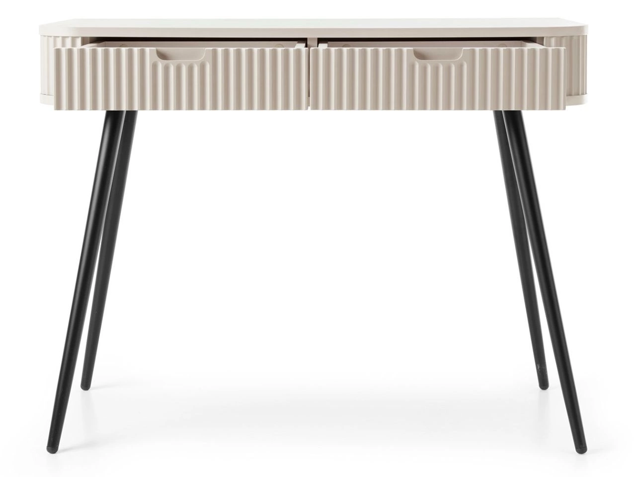 Toaletka wyposażona jest w dwie przestronne szuflady, które poruszają się na niezawodnych prowadnicach rolkowych, gwarantując płynne i ciche użytkowanie. Żłobione uchwyty oraz subtelne wycięcia ułatwiają dostęp do wnętrza, a smukłe, czarne nogi podkreślają prosty, minimalistyczny design. Toaletka Viva to idealny wybór dla osób ceniących połączenie stylu i funkcjonalności
