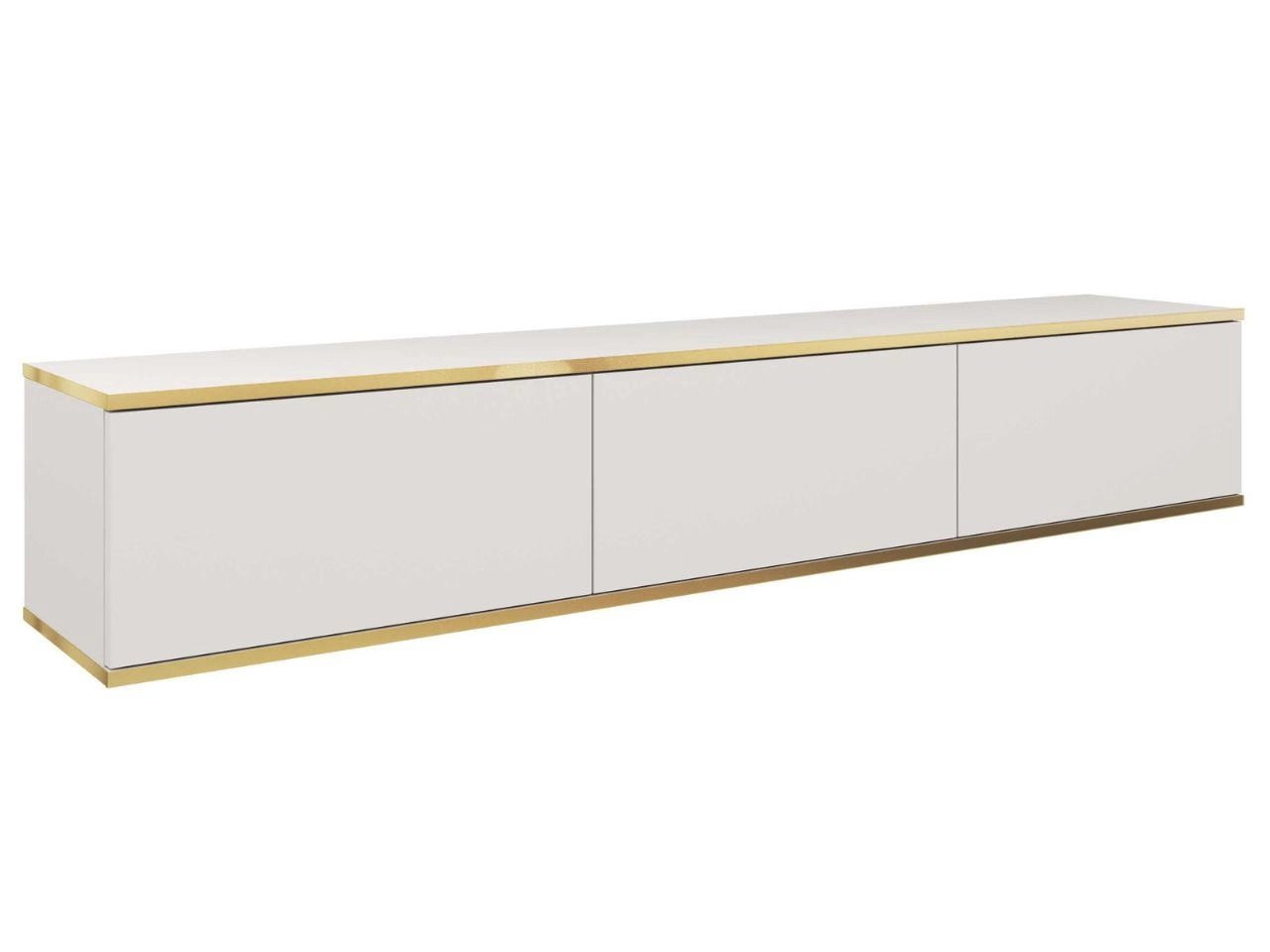 Wisząca szafka RTV Diolo to nowoczesny mebel, który wyróżnia się elegancją i funkcjonalnością. Wykonany z wysokiej jakości szarej płyty laminowanej, posiada złote krawędzie, nadające mu wyjątkowy charakter. Ta biała szafka RTV doskonale sprawdzi się we wnętrzach urządzonych w stylu glamour.