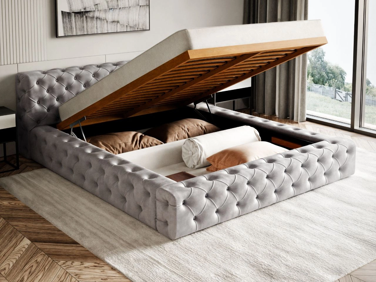 Łóżko występuje w rozmiarze 140x200 cm. Mebel doskonale wpasuje się zarówno w małą, jak i bardzo przestronną sypialnię. Świetnym rozwiązaniem jest wbudowany obszerny pojemnik na pościel, do którego dostęp uzyskujemy poprzez uniesienie od frontu dołączonego do zestawu stelaża. O łatwość tego procesu dbają wysokiej klasy automaty sprężynowe wspomagające otwieranie.