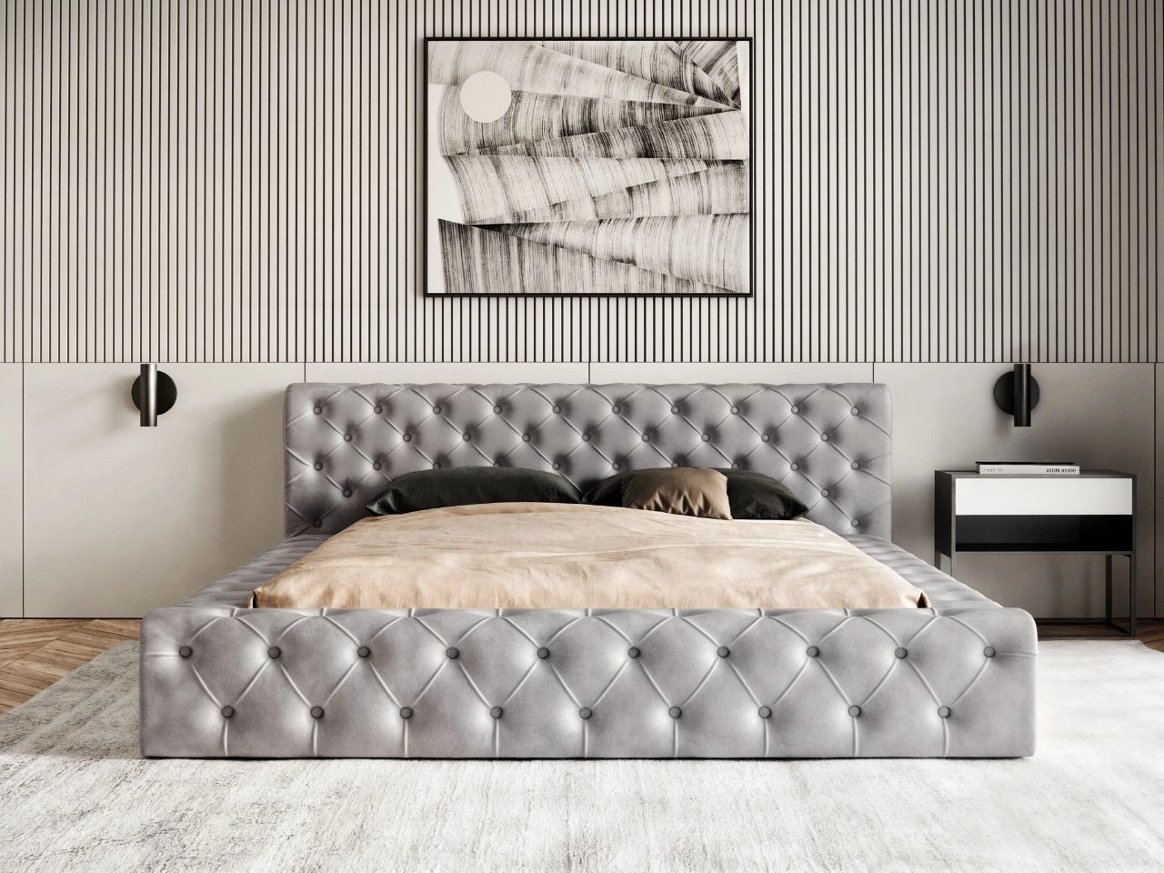 Łóżko tapicerowane Palini, to bardzo ciekawy mebel, który nawiązuje swoim wyglądem wprost do stylistyki glamour, o czym świadczy głębokie pikowanie na wszystkich elementach mebla. Świetnie prezentuje się masywne wezgłowie, które nie jest tylko elementem dekoracyjnym, ale pełni również funkcję praktyczną, dając podparcie plecom podczas oglądania telewizji, czy czytania książki.