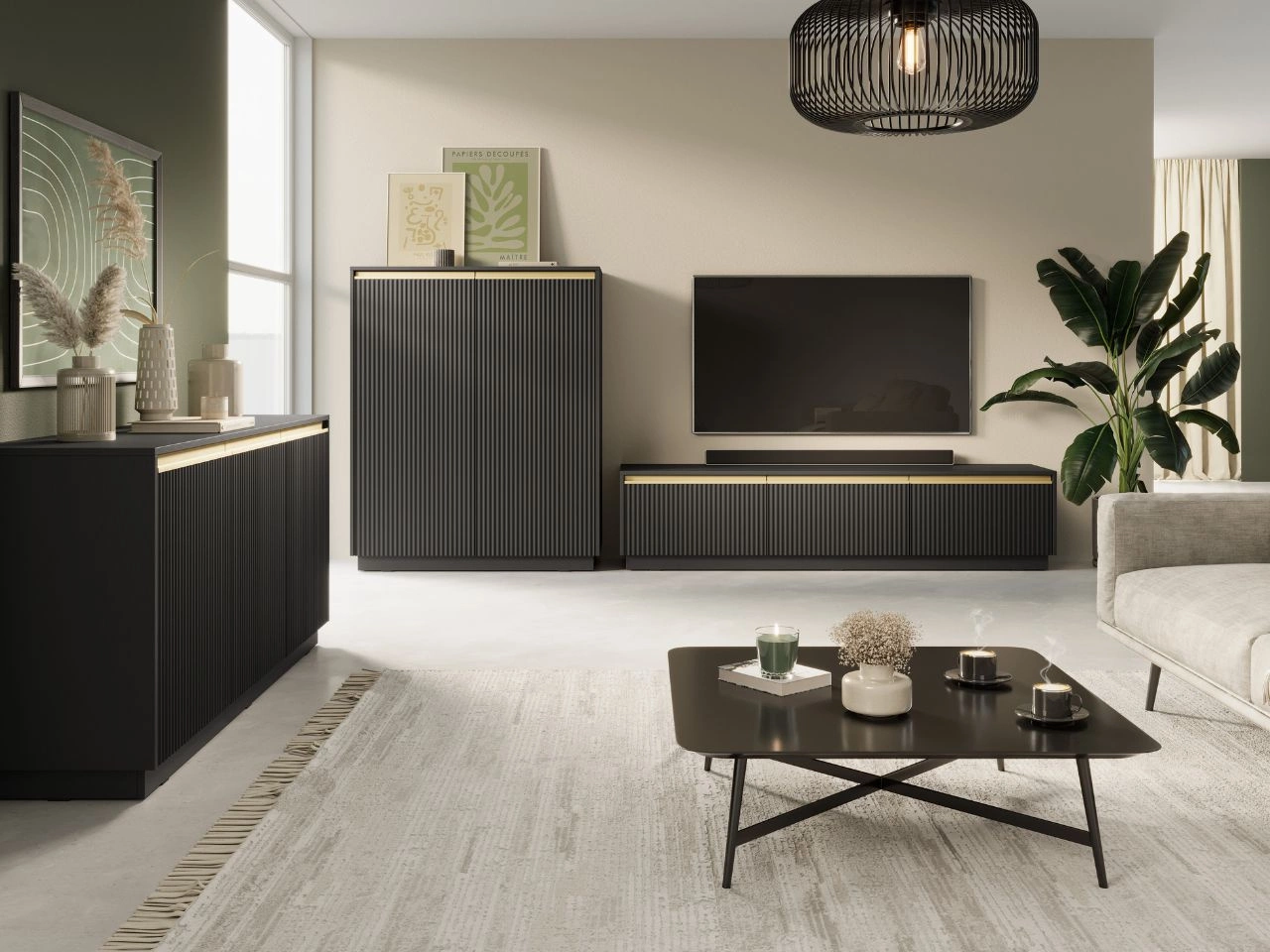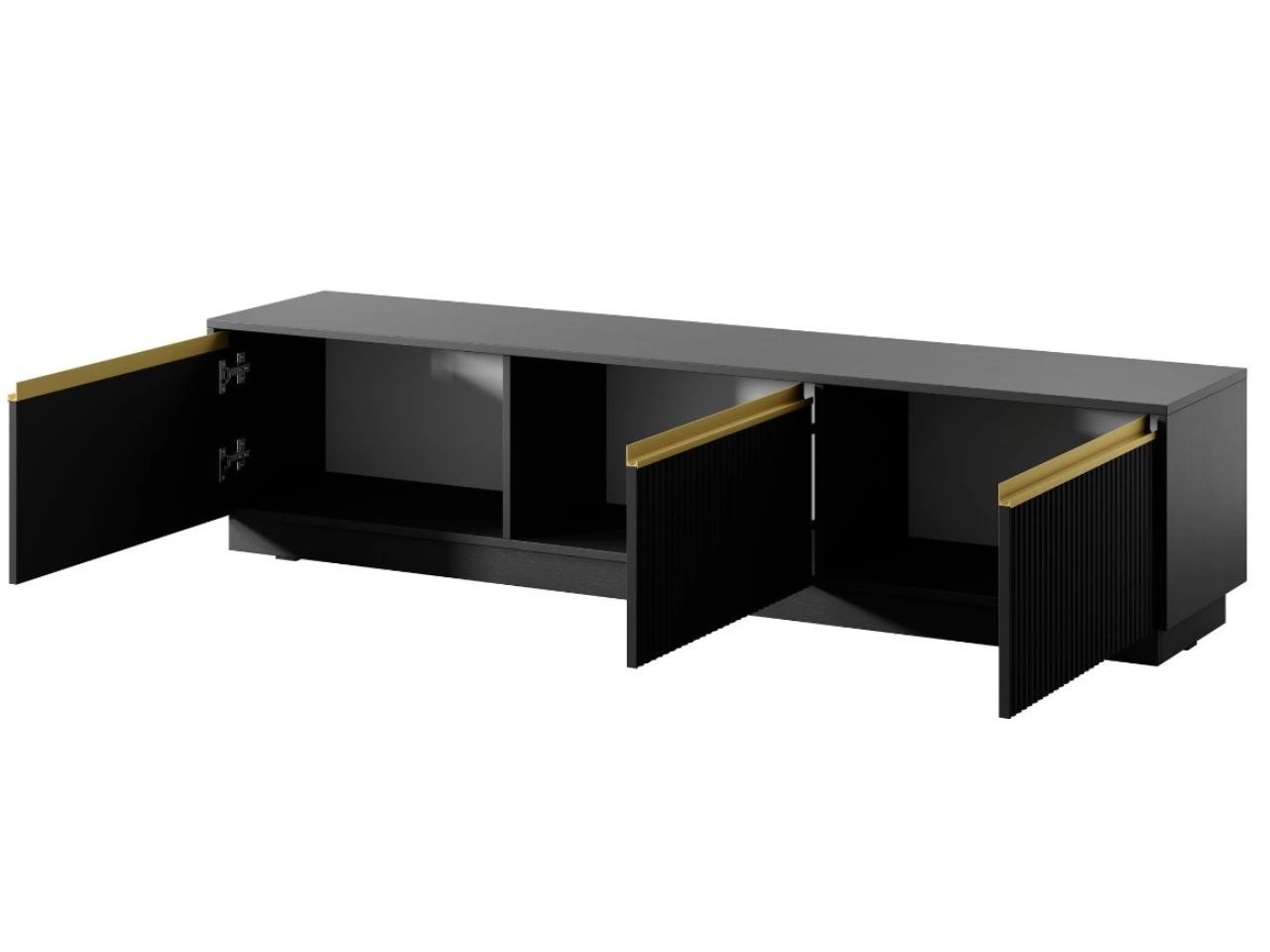 Szafka RTV z kolekcji Roland to elegancki i funkcjonalny element do nowoczesnych wnętrz. Jej design wyróżniają ryflowane fronty, które nadają meblowi unikalny, trójwymiarowy charakter. Subtelne detale, takie jak wgłębienia uchwytów pokryte złotą powłoką proszkową, dodają całości elegancji, jednocześnie podkreślając minimalistyczny wygląd.