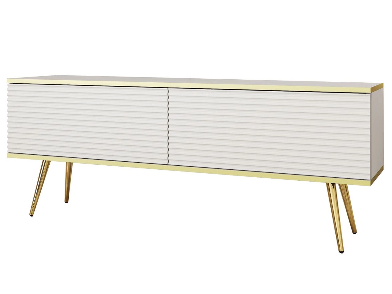 Szafka pod telewizor z drzwiczkami 135 cm z ryflowanym frontem Diolo Biała na złotych nogach
