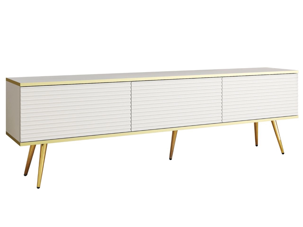 Szafka RTV Dioloto nowoczesny mebel, który łączy elegancję z praktycznością. Wykonana z trwałego białego laminatu z delikatnymi złotymi akcentami, dodaje wnętrzu wyjątkowego charakteru i pasuje do stylu glamour, wprowadzając luksusowy akcent.
