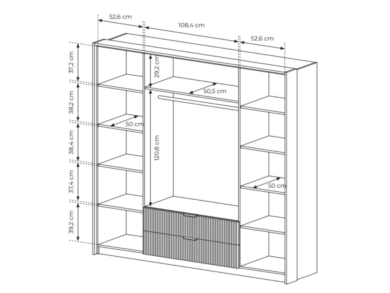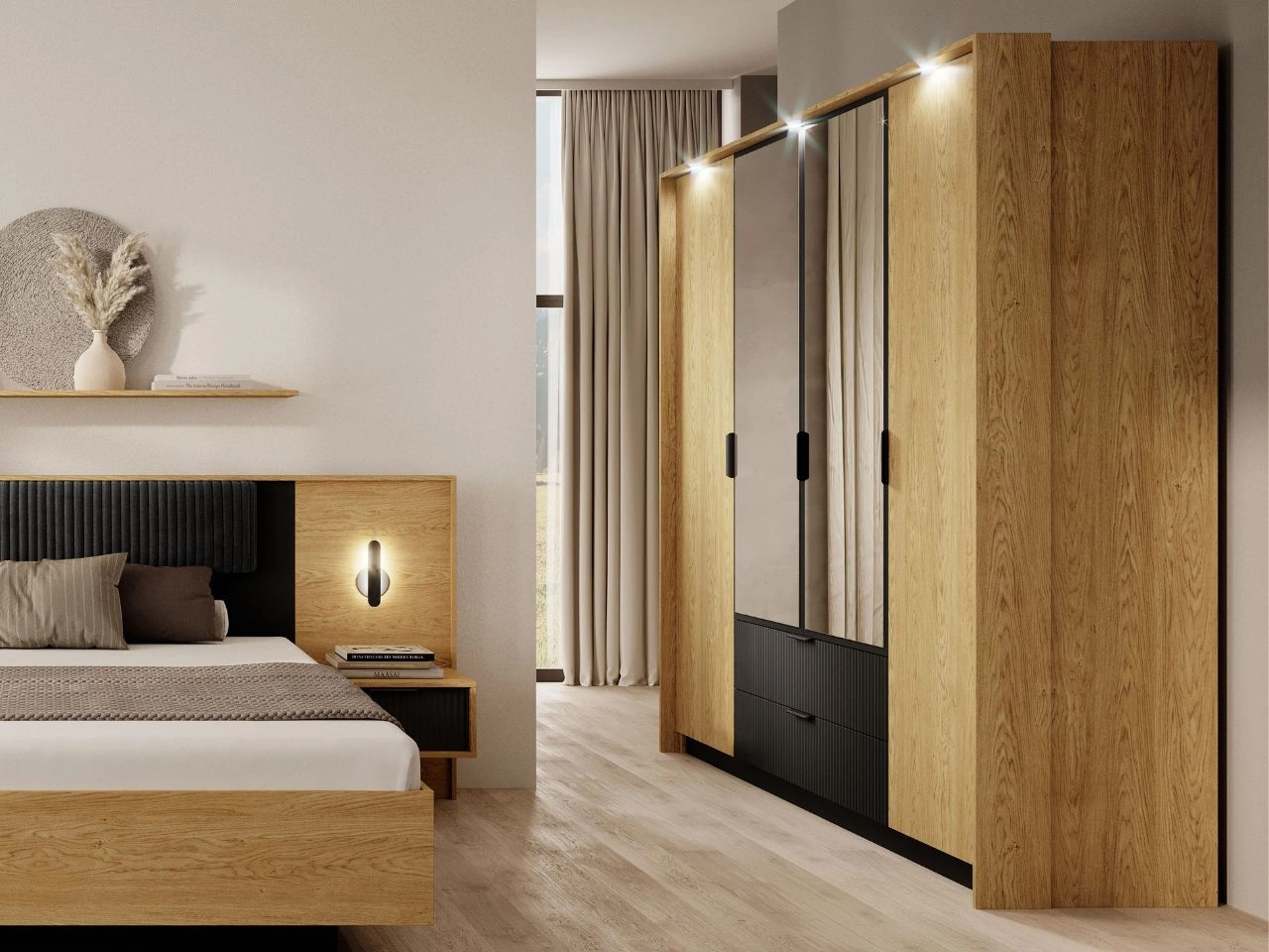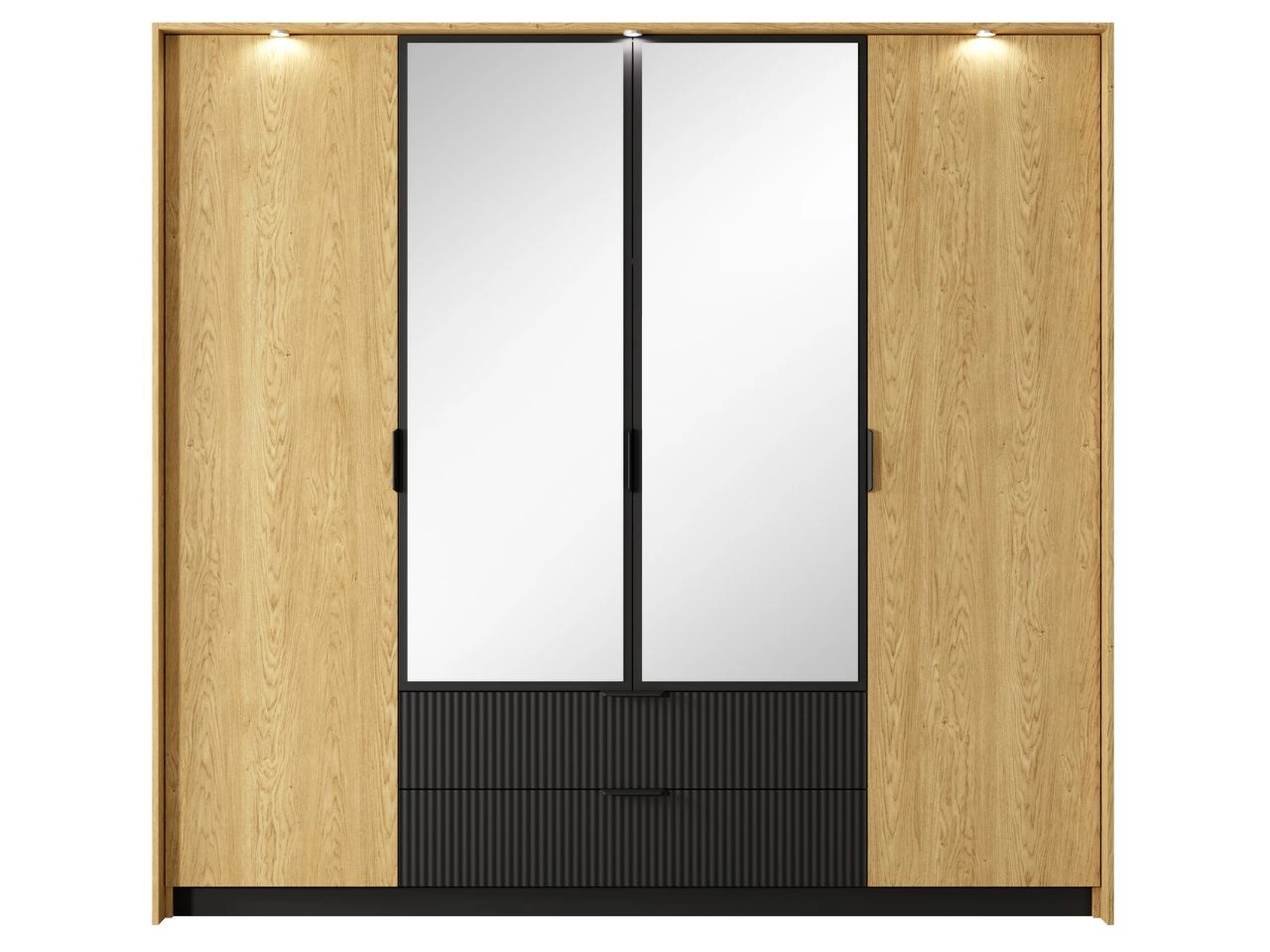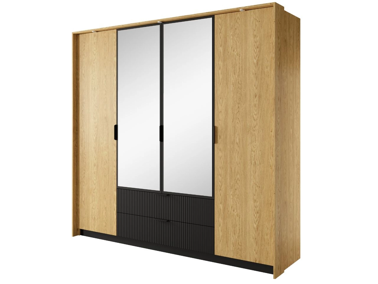 Wyposażona w dwie czarne szuflady z pełnym wysuwem i systemem cichego domyku, zapewnia komfortowe i bezgłośne użytkowanie. Lustra na drzwiach nie tylko zwiększają funkcjonalność, ale również optycznie powiększają przestrzeń. Wnętrze szafy oferuje dziewięć pojemnych półek oraz drążek na ubrania, umożliwiając wygodną organizację przechowywania.