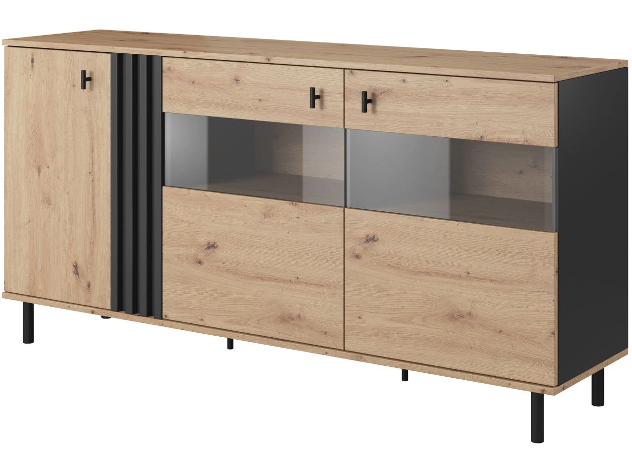 Meble wyróżniają się wysokimi metalowymi nogami, które nadają im lekkości i podkreślają nowoczesny styl. Wykończenie w kolorze dębu Artisan w połączeniu z czarnymi akcentami tworzy harmonijny kontrast, który łączy naturalne ciepło drewna z elegancją czerni. Komoda Malone to doskonała kombinacja designu, funkcjonalności i trwałości, idealnie pasująca do każdej stylowej aranżacji wnętrza.