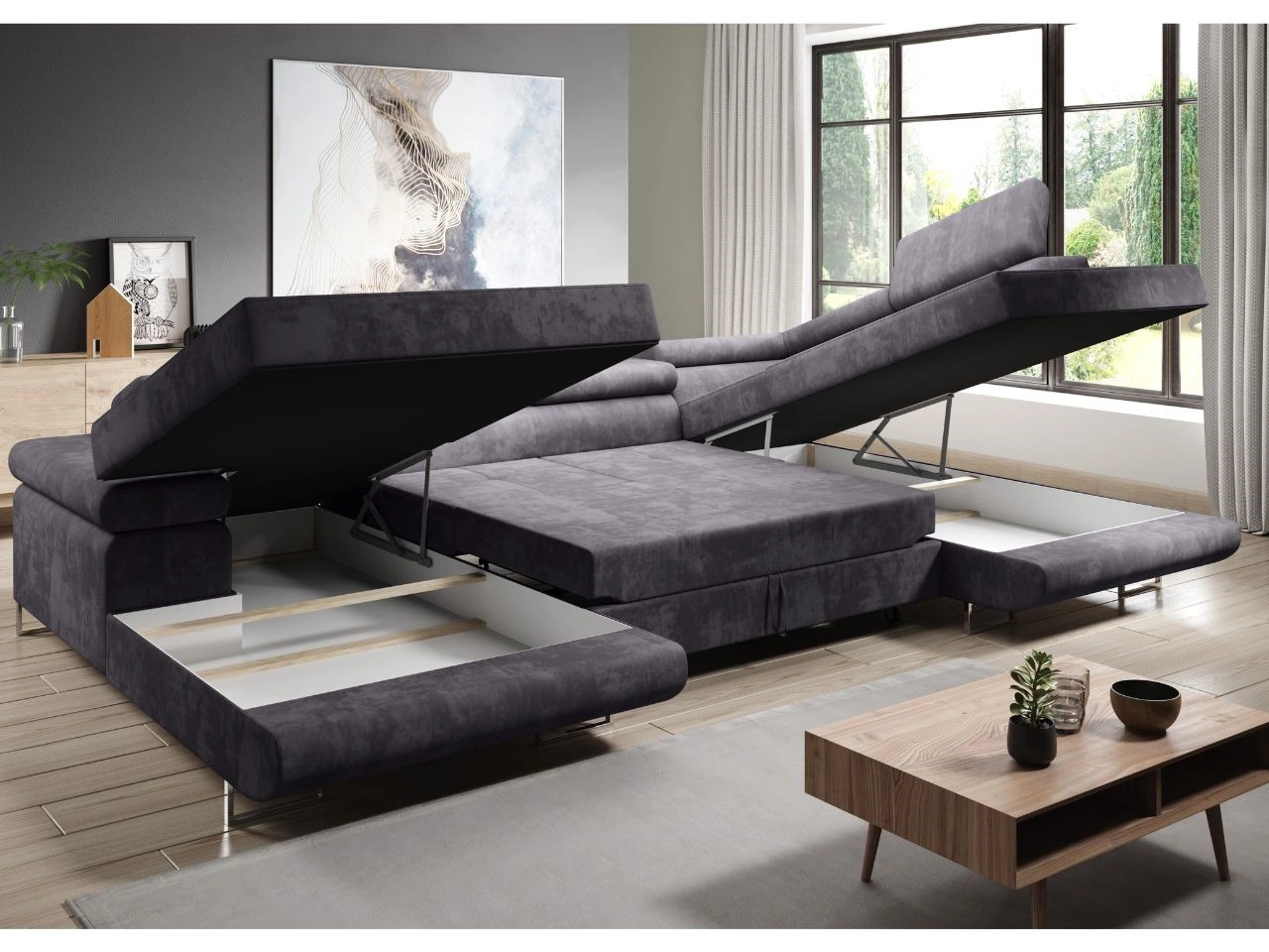 Funkcja spania sprawia, że narożnik można w łatwy sposób przekształcić w przestronne i wygodne łóżko. Dodatkowym atutem są dwa pojemniki na pościel, które zapewniają mnóstwo miejsca do przechowywania. Regulowane zagłówki zwiększają komfort użytkowania i nadają meblowi elegancki wygląd.
