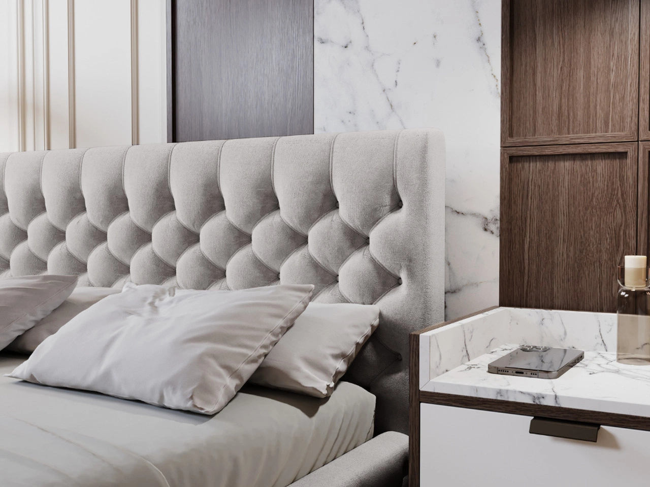 Łóżko tapicerowane Velutto to doskonały wybór dla osób, które chcą nadać swojej sypialni wyrafinowany, elegancki charakter. Jego powierzchnia ozdobiona jest wyrazistym, głębokim pikowaniem, które podkreśla luksusowy styl mebla i wprowadza do wnętrza wyjątkową atmosferę. Model inspirowany estetyką glamour wyróżnia się ponadczasowym wyglądem, dzięki czemu świetnie sprawdza się zarówno w aranżacjach klasycznych, jak i bardziej nowoczesnych.