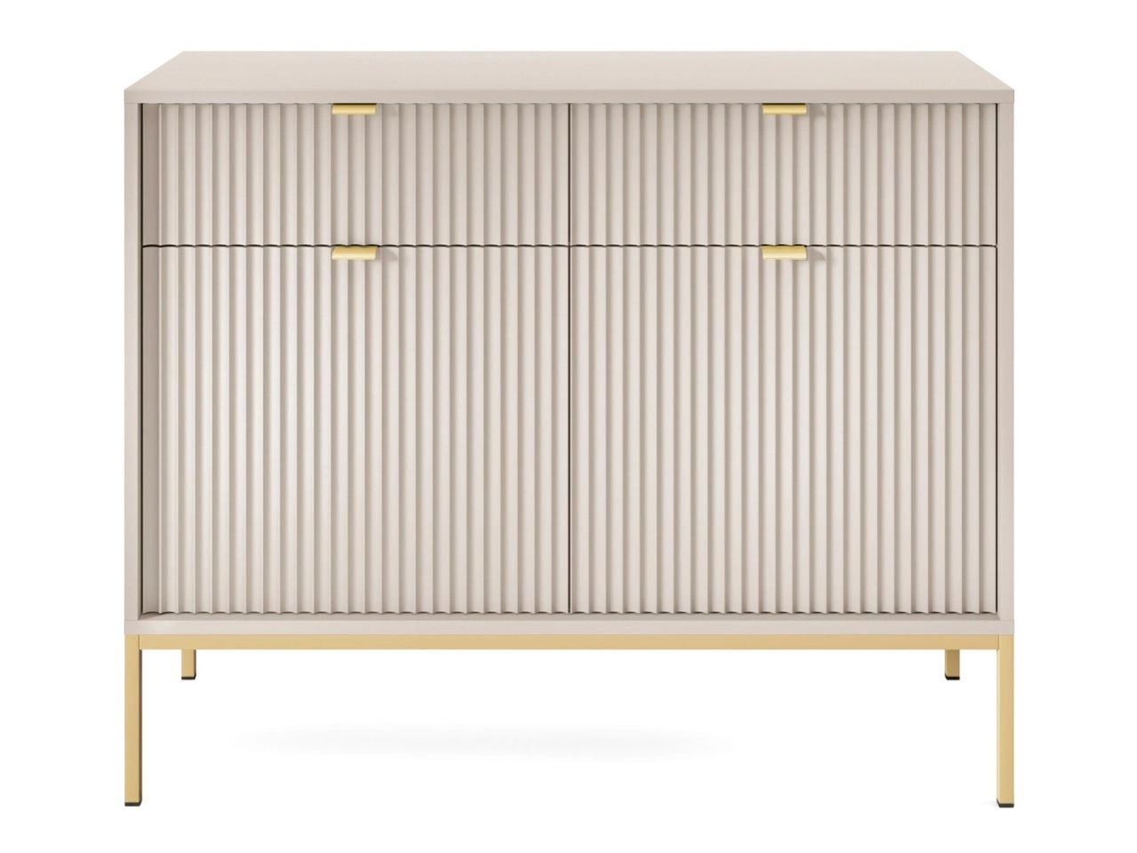 Wnętrze mebla zostało zaprojektowane z myślą o praktycznym użytkowaniu — komoda oferuje dwie szuflady oraz dwa fronty otwierane, które zapewniają wygodną przestrzeń do przechowywania codziennych drobiazgów, dokumentów czy tekstyliów. Wyraziste ryflowane fronty dodają całości nowoczesnego akcentu, a delikatne uchwyty podkreślają dopracowany, elegancki wygląd.