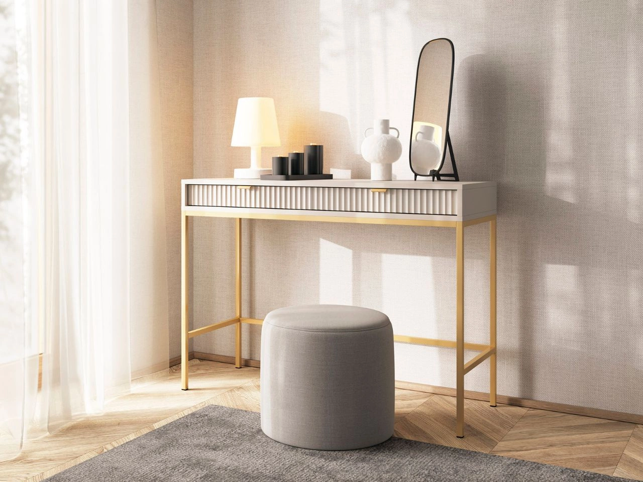 Toaletka Amber łączy w sobie prostotę i elegancję, tworząc harmonijny i ponadczasowy element wyposażenia. Jej lekka bryła została osadzona na stabilnych, stalowych nogach, które nadają meblowi nowoczesny charakter i jednocześnie zapewniają trwałość konstrukcji. Toaletka przyciąga uwagę subtelnym stylem i wysoką estetyką wykonania, idealnie wpisując się w różne aranżacje wnętrz — od minimalistycznych po bardziej klasyczne.