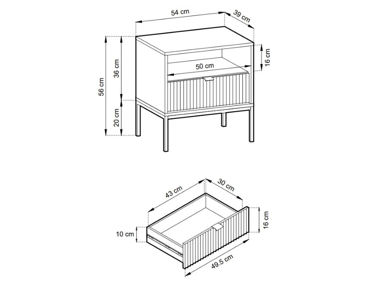 Model wyposażono w praktyczną szufladę, idealną do przechowywania podręcznych przedmiotów, takich jak książki, drobne akcesoria czy kosmetyki. Charakterystyczne ryflowane fronty dodają całości wyrazistego charakteru, podkreślając elegancką stylistykę kolekcji Amber. Subtelne uchwyty stanowią gustowne uzupełnienie projektu.