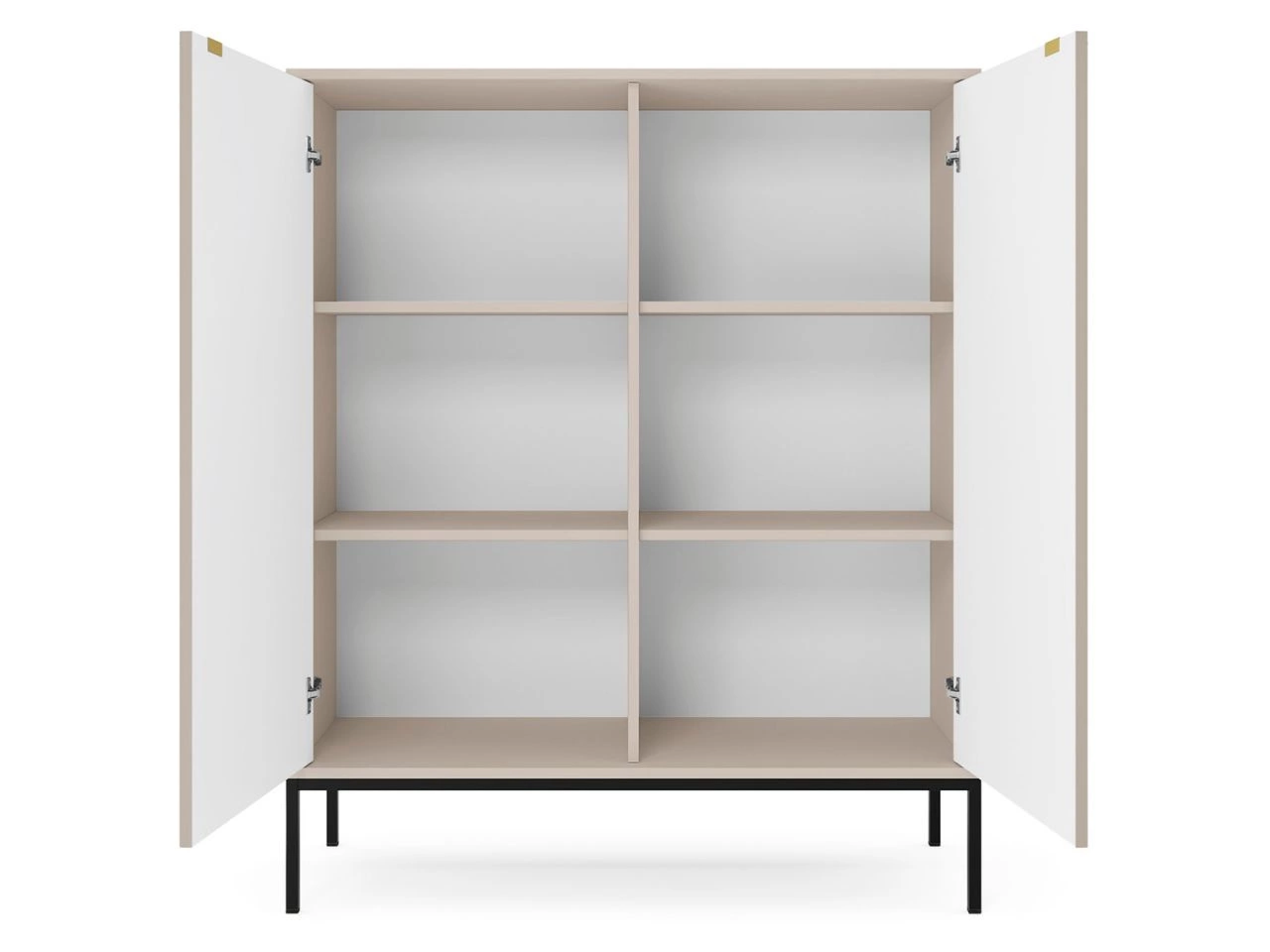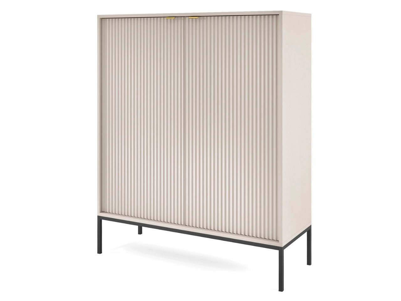 Wysoka komoda łączy funkcjonalność z minimalistyczną estetyką. Zamknięte wnętrze umożliwia estetyczne ukrycie przedmiotów codziennego użytku, a sama bryła prezentuje się lekko i nowocześnie, tworząc efektowny element aranżacyjny całego zestawu.