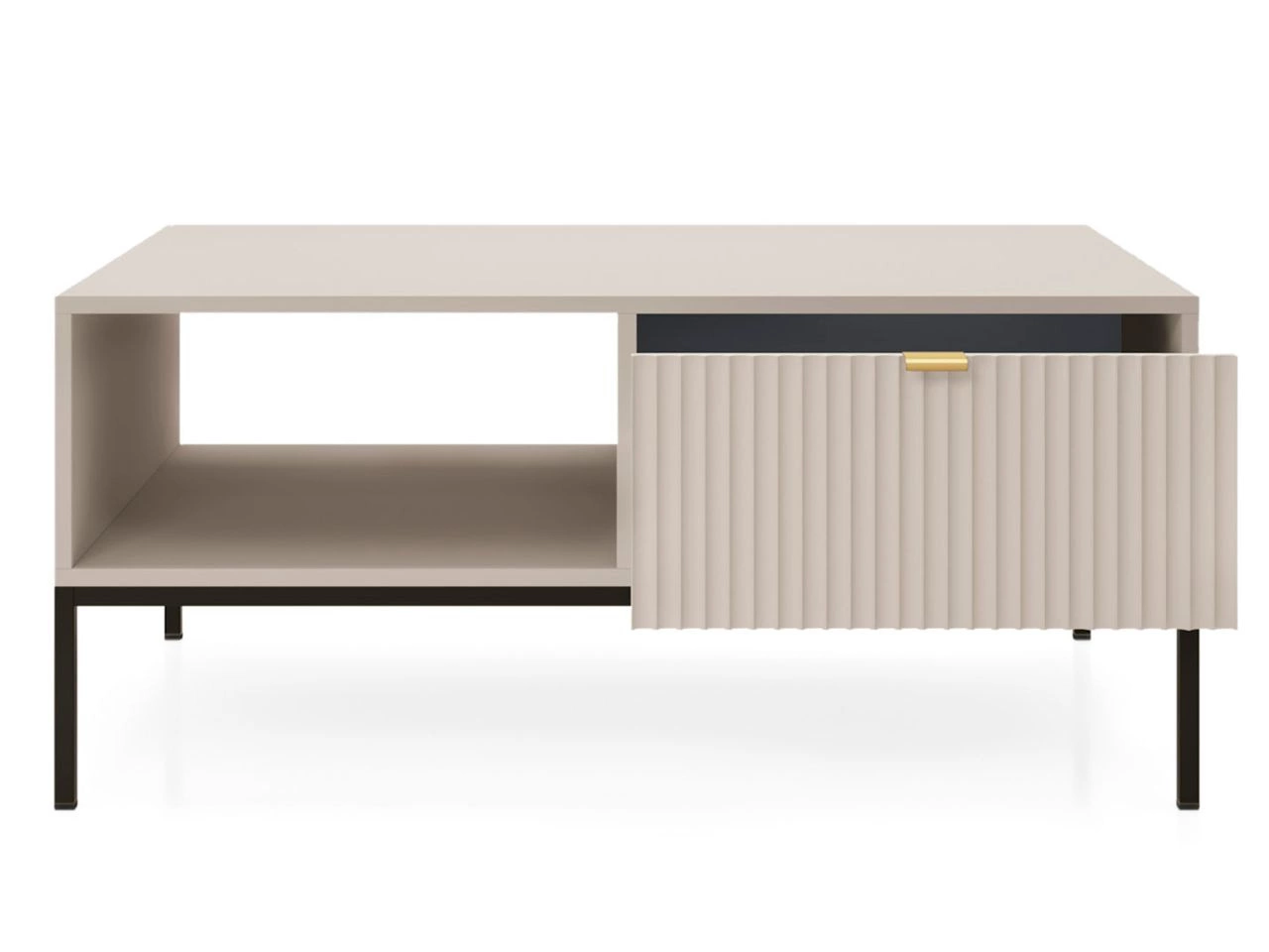 Stolik kawowy pełni rolę funkcjonalnego centrum salonu. Prostokątny blat i lekka konstrukcja stelaża sprawiają, że doskonale wpisuje się w codzienne użytkowanie — jako miejsce na dekoracje, napoje czy praktyczne drobiazgi. Dzięki spójnemu wzornictwu doskonale łączy się z pozostałymi elementami kolekcji.