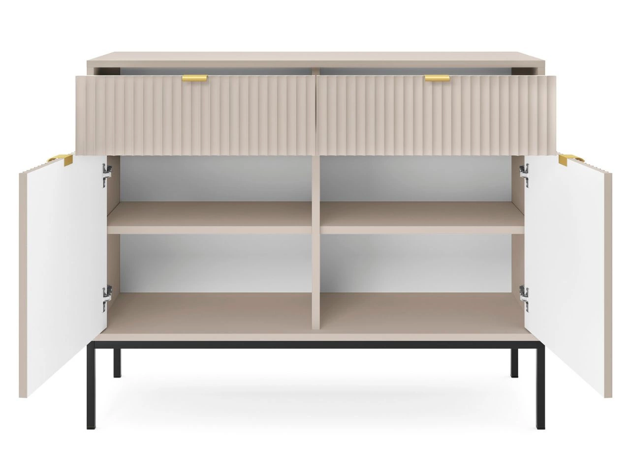 Komoda oferuje pojemne przestrzenie do przechowywania, w tym praktyczne szuflady ułatwiające organizację codziennych przedmiotów, dzięki czemu świetnie sprawdzi się jako główny element porządkujący salon lub jadalnię. Jej elegancka forma i spokojna linia frontów pozwalają zachować ład we wnętrzu, jednocześnie stanowiąc wyrazisty, dekoracyjny akcent aranżacji.