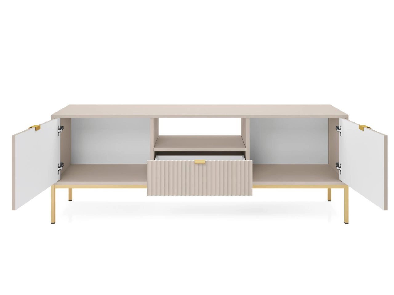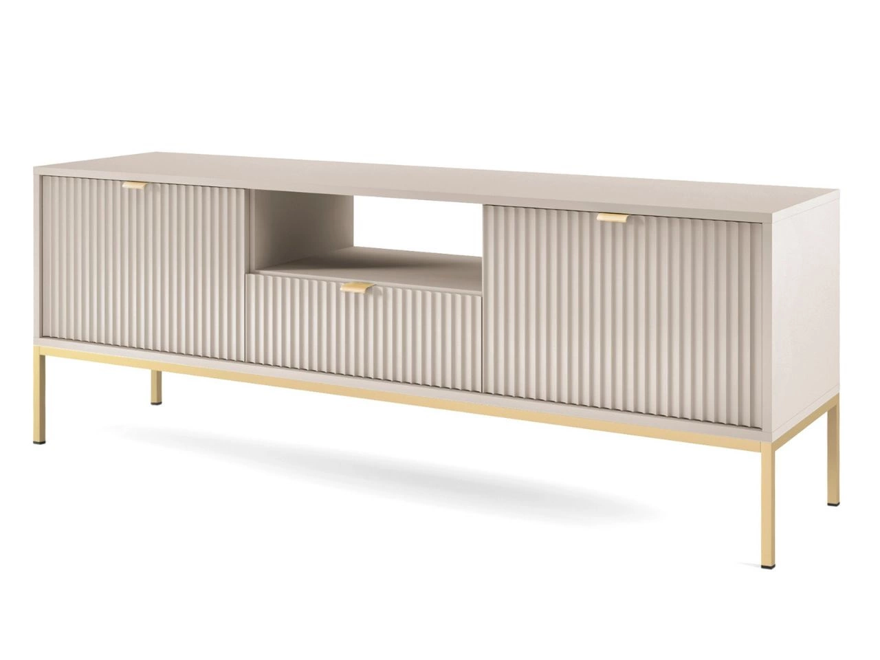 Zestaw mebli do salonu Amber to propozycja dla osób, które chcą stworzyć wnętrze eleganckie, funkcjonalne i utrzymane w nowoczesnym, harmonijnym stylu. Kolekcja została wykończona w subtelnym, kaszmirowym odcieniu, który wprowadza do przestrzeni lekkość i ponadczasową estetykę. Wysokiej jakości płyta laminowana oraz fronty wykonane z płyty MDF 18 mm, zabezpieczone trwałym obrzeżem ABS, gwarantują solidność, a przemyślane detale – takie jak ryflowane powierzchnie czy złote, szczotkowane uchwyty – podnoszą poziom elegancji i komfortu użytkowania.