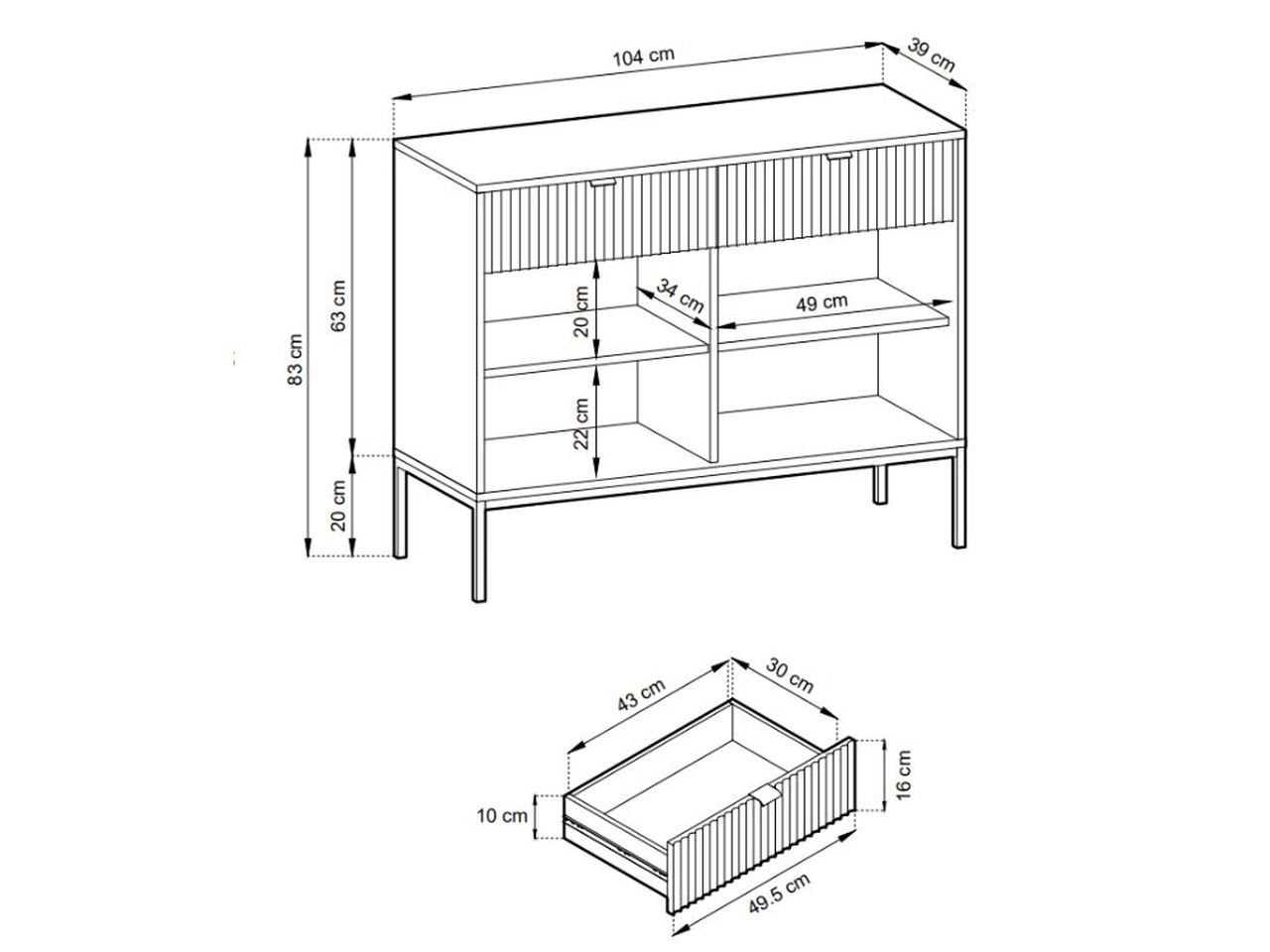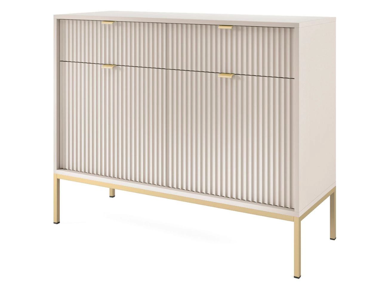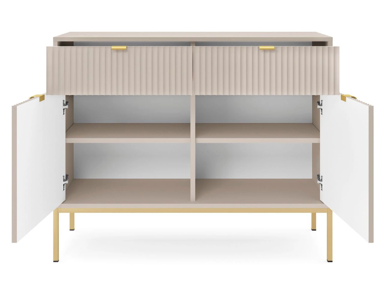 Komoda oferuje pojemne przestrzenie do przechowywania, w tym praktyczne szuflady ułatwiające organizację codziennych przedmiotów, dzięki czemu świetnie sprawdzi się jako główny element porządkujący salon lub jadalnię. Jej elegancka forma i spokojna linia frontów pozwalają zachować ład we wnętrzu, jednocześnie stanowiąc wyrazisty, dekoracyjny akcent aranżacji.