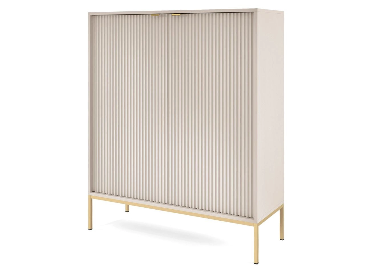 Wysoka komoda łączy funkcjonalność z minimalistyczną estetyką. Zamknięte wnętrze umożliwia estetyczne ukrycie przedmiotów codziennego użytku, a sama bryła prezentuje się lekko i nowocześnie, tworząc efektowny element aranżacyjny całego zestawu.