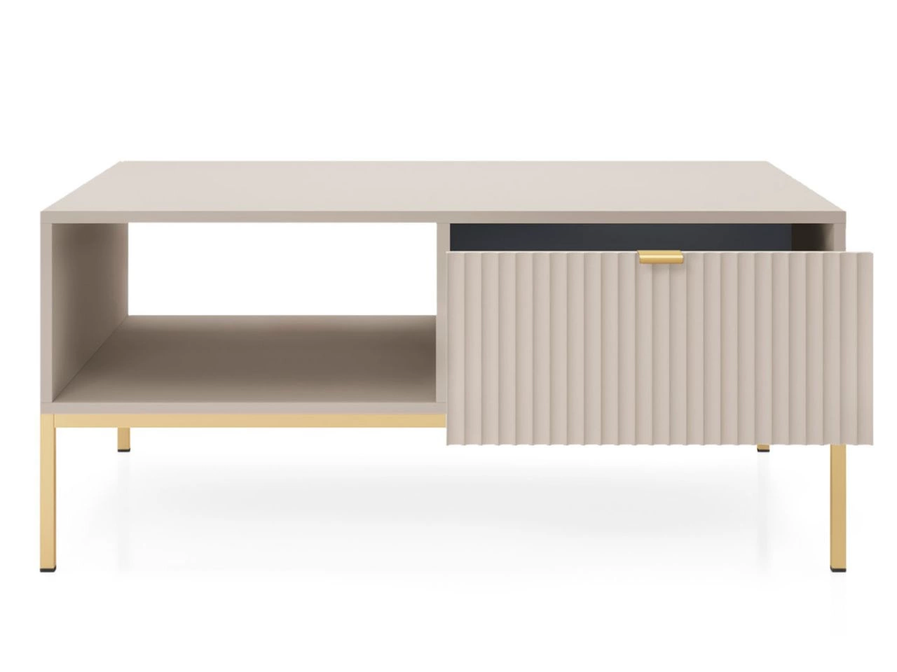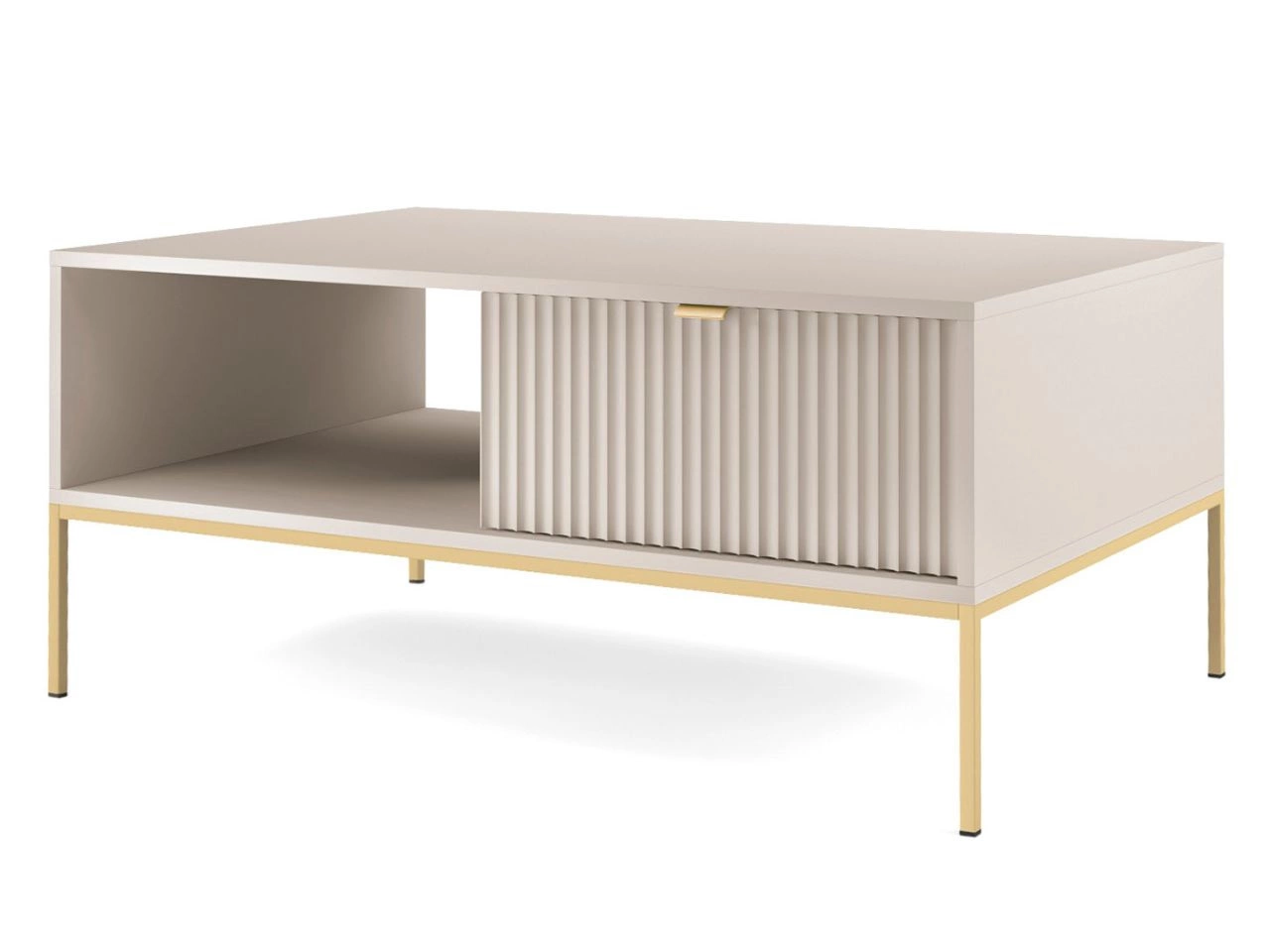 Stolik kawowy pełni rolę funkcjonalnego centrum salonu. Prostokątny blat i lekka konstrukcja stelaża sprawiają, że doskonale wpisuje się w codzienne użytkowanie — jako miejsce na dekoracje, napoje czy praktyczne drobiazgi. Dzięki spójnemu wzornictwu doskonale łączy się z pozostałymi elementami kolekcji.