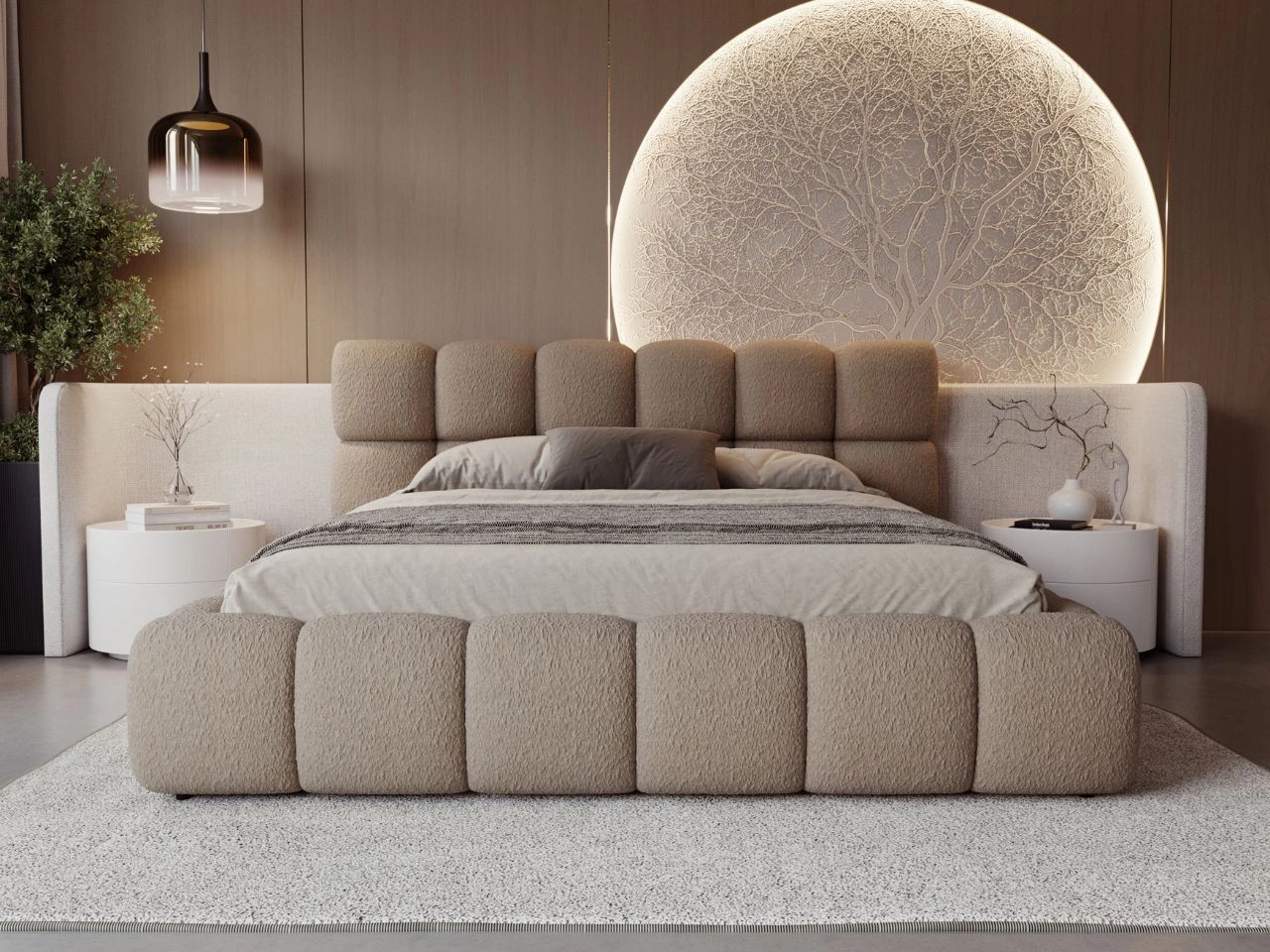 Łóżko tapicerowane z pojemnikiem na pościel i stelażem 140x200 Modo w tkaninie bouclé Brązowe
