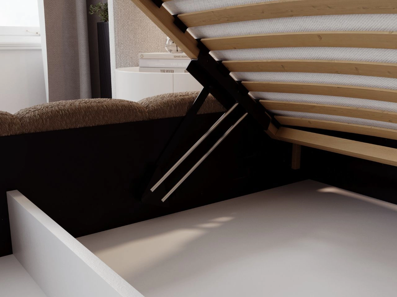 Skrzynia dwuosobowego łóżka Modo również została wykończona w miękki sposób, dzięki zastosowaniu pianki tapicerskiej. Wewnątrz skrzyni ukryty jest przestronny i praktyczny pojemnik na pościel. Do przechowywanych w nim przedmiotów uzyskujemy dostęp poprzez uniesienie ku górze od frontu dołączonego do zestawu drewnianego stelaża pod materac (materac nie znajduje się w zestawie). Sam proces przebiega w bardzo łatwy i niemal bezwysiłkowy sposób, dzięki zastosowaniu automatów sprężynowych wspomagających otwieranie.