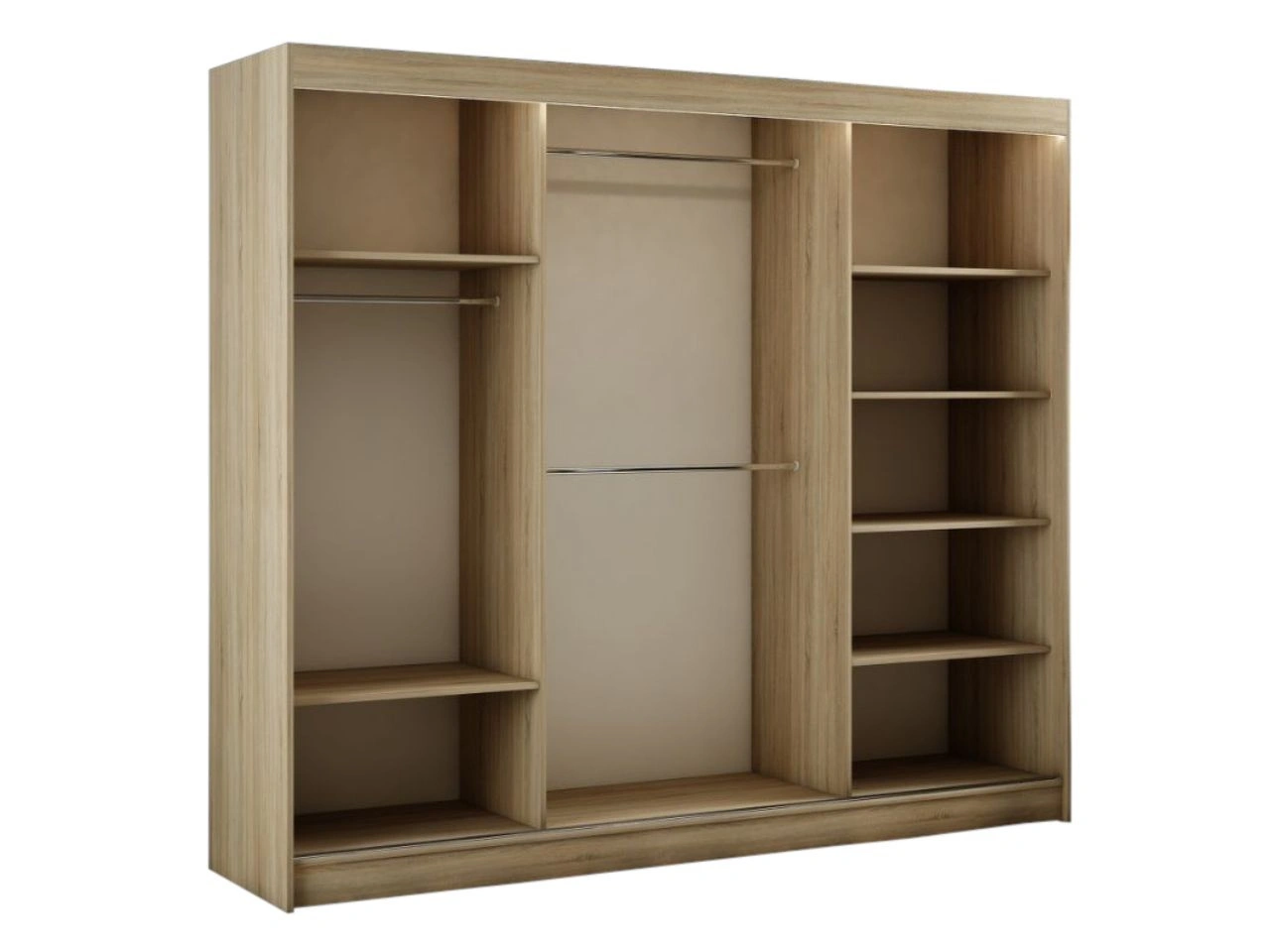 Wnętrze szafy zostało zaprojektowane z myślą o wygodnym przechowywaniu – wyposażone jest w drążki na wieszaki oraz praktyczne półki, które ułatwiają organizację odzieży i dodatków. Oświetlenie LED podkreśla nowoczesny design oraz znacząco zwiększa komfort codziennego użytkowania.