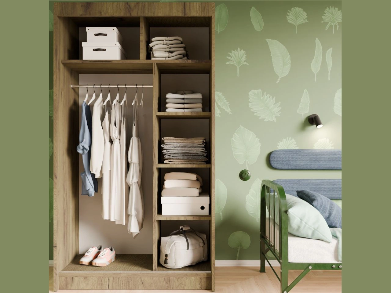 Wnętrze szafy Fano zaprojektowano z myślą o funkcjonalnym przechowywaniu – wyposażone jest w drążek na wieszaki oraz praktyczne półki, które ułatwiają uporządkowanie odzieży i dodatków.