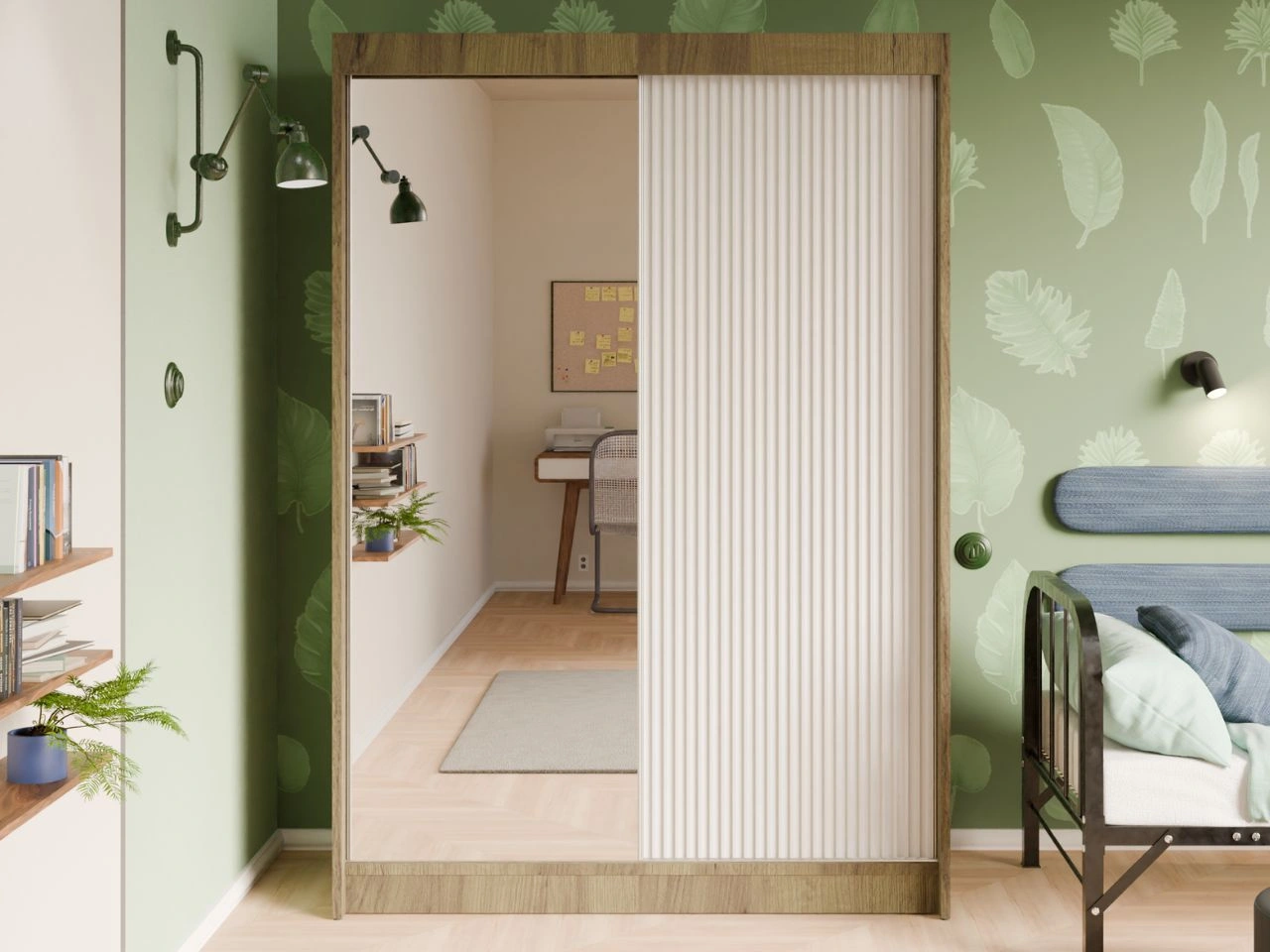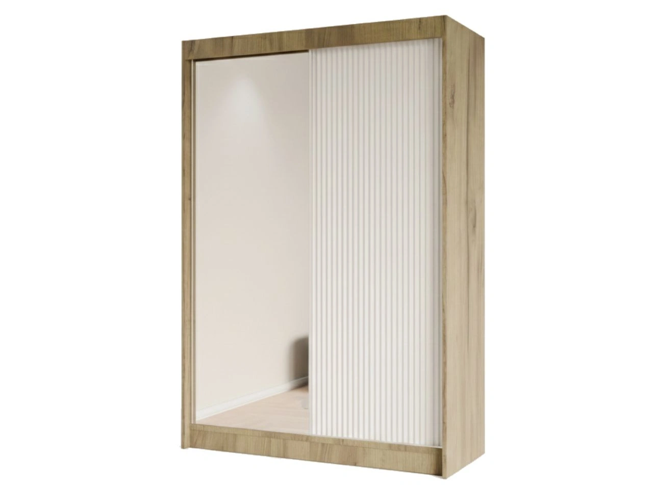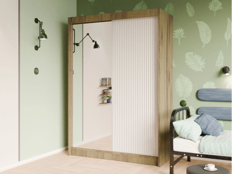 Szafa przesuwna z ryflowanym frontem i lustrem 150 cm Fano Dąb Craft Złoty, Biała