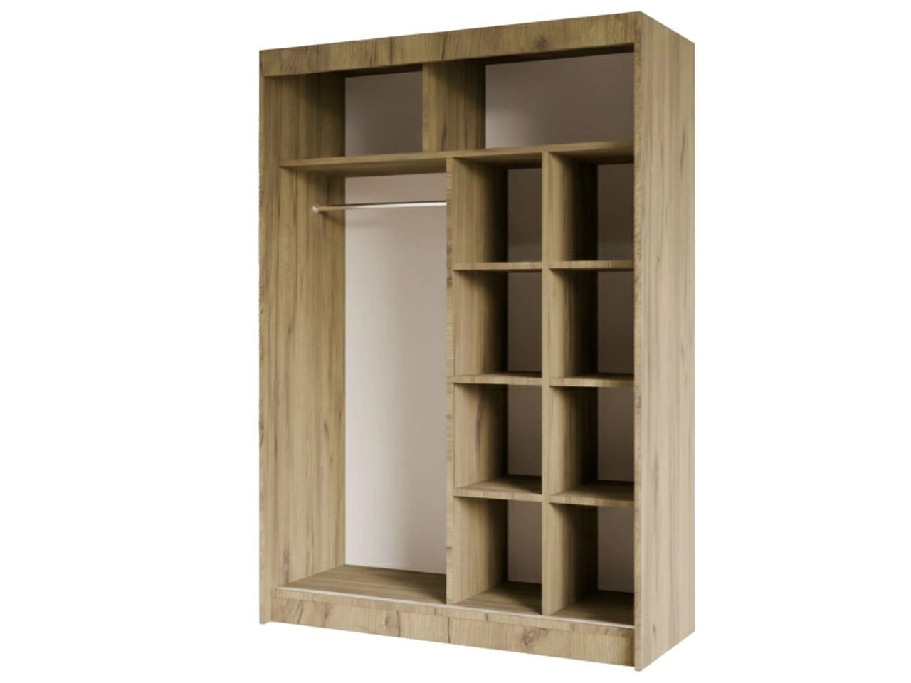 Wnętrze szafy Fano zostało zaprojektowane z myślą o praktycznym przechowywaniu – znajduje się w nim drążek na wieszaki oraz funkcjonalne półki, które ułatwiają uporządkowanie ubrań i dodatków.
