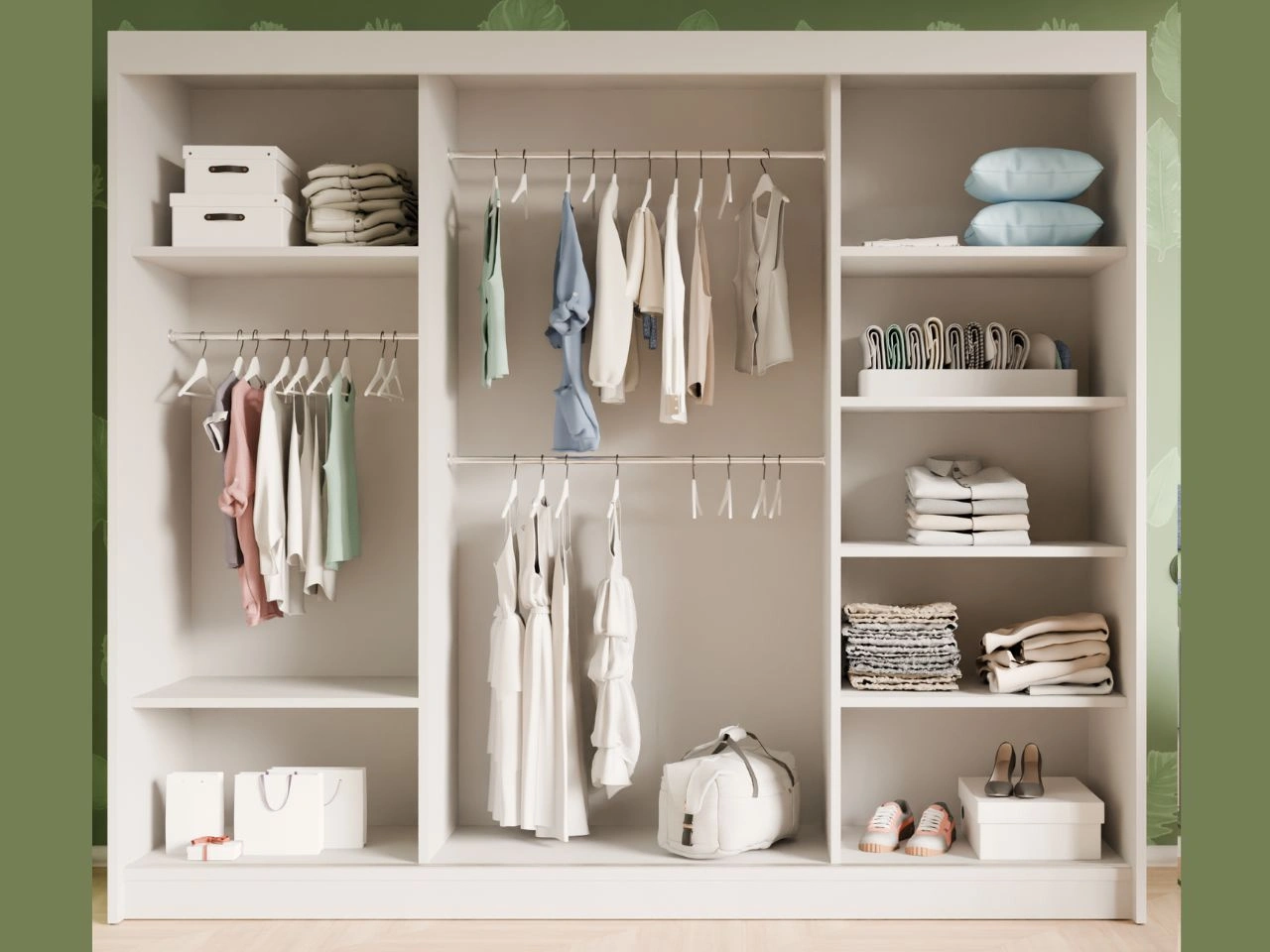 Wnętrze szafy Fano zaprojektowano z myślą o funkcjonalnym przechowywaniu – wyposażone jest w drążki na ubrania oraz praktyczne półki, które ułatwiają organizację odzieży, dodatków i akcesoriów.