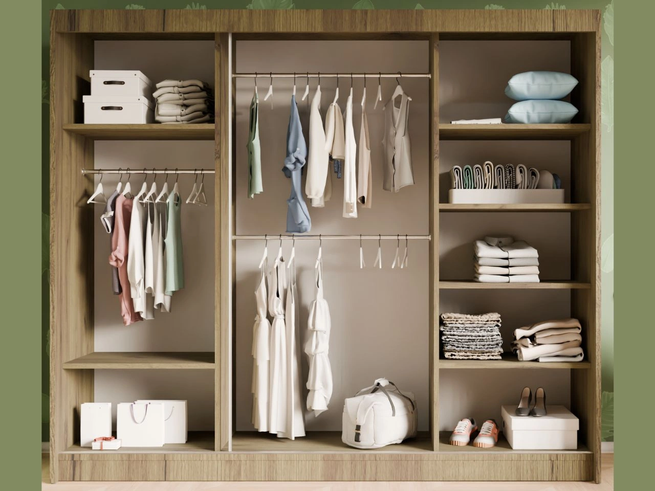 Wnętrze szafy Fano zaprojektowano z myślą o funkcjonalnym przechowywaniu – wyposażone jest w drążki na ubrania oraz praktyczne półki, które ułatwiają organizację odzieży, dodatków i akcesoriów.