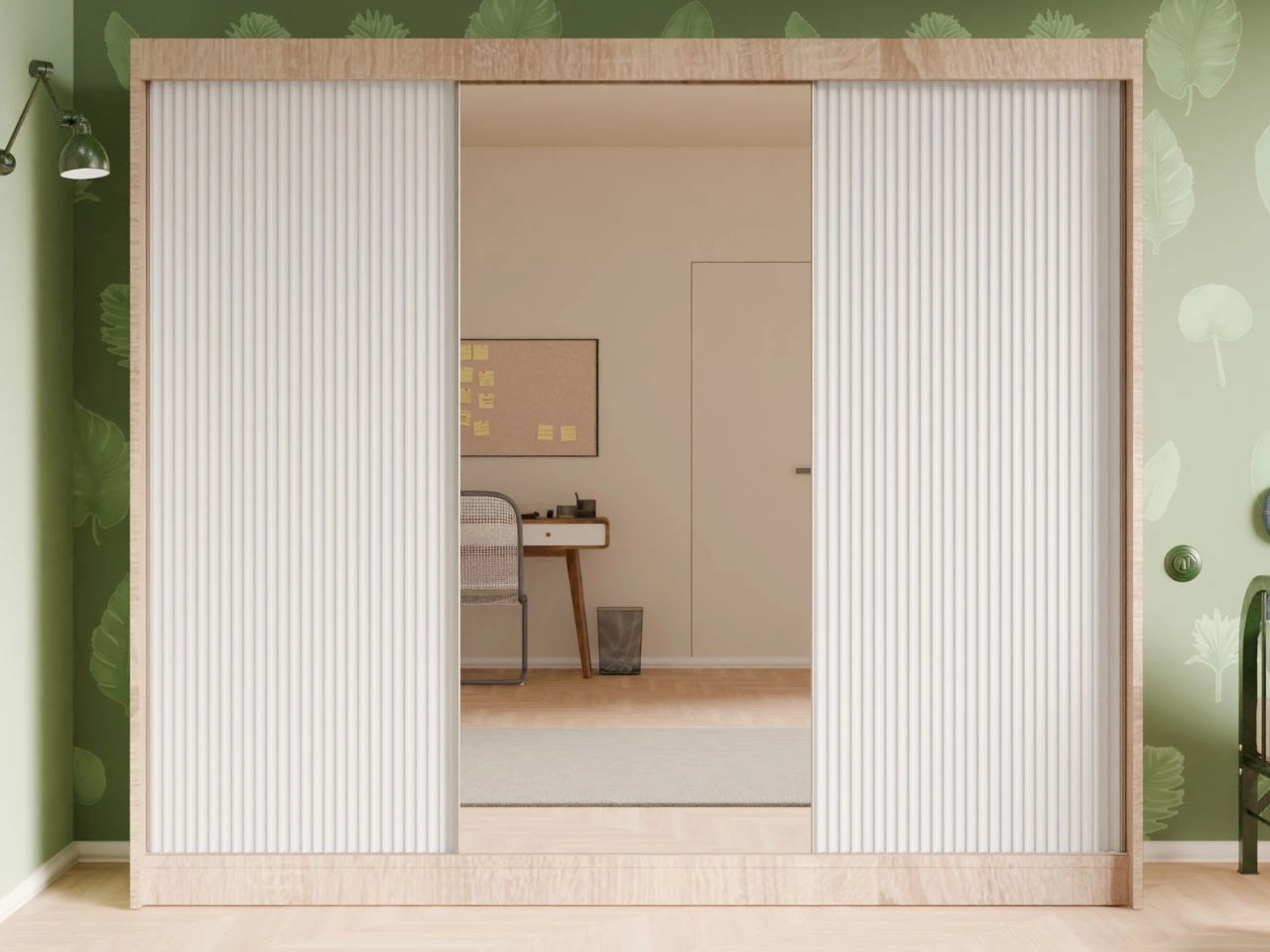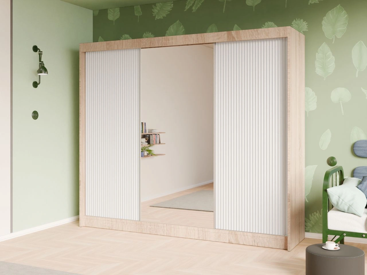 Szafa przesuwna z ryflowanym frontem i lustrem 250 cm Fano Dąb Sonoma, Biała