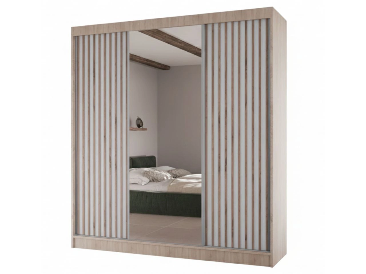 Szafa przesuwna z lamelami i lustrem 200 cm Lucena Dąb Sonoma, Biała