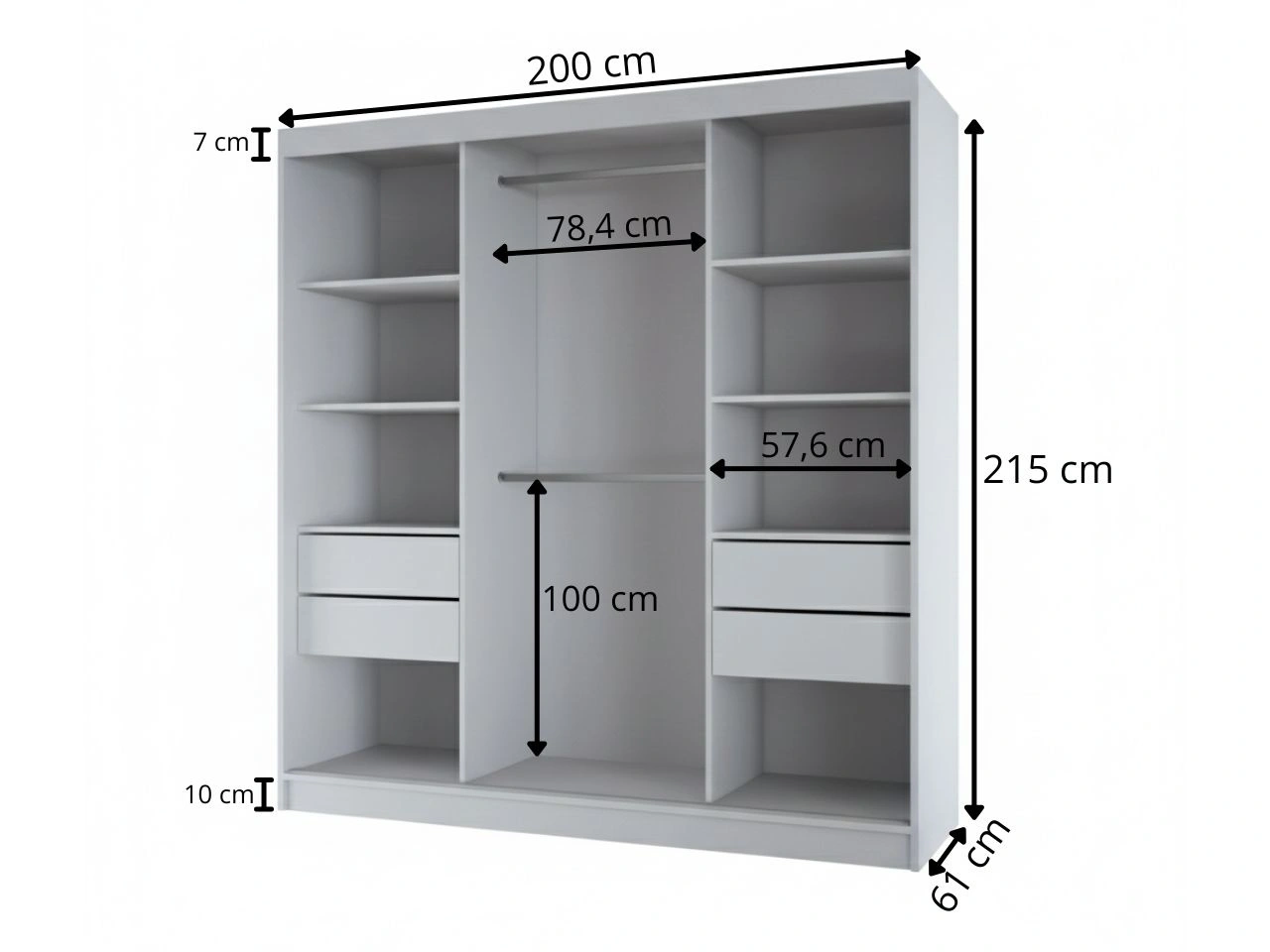 Wnętrze szafy Lucena zostało zaprojektowane z myślą o wygodnej organizacji przechowywania. Układ obejmuje strefę z drążkami na odzież wiszącą, praktyczne półki oraz szuflady, które ułatwiają segregację ubrań i dodatków.
