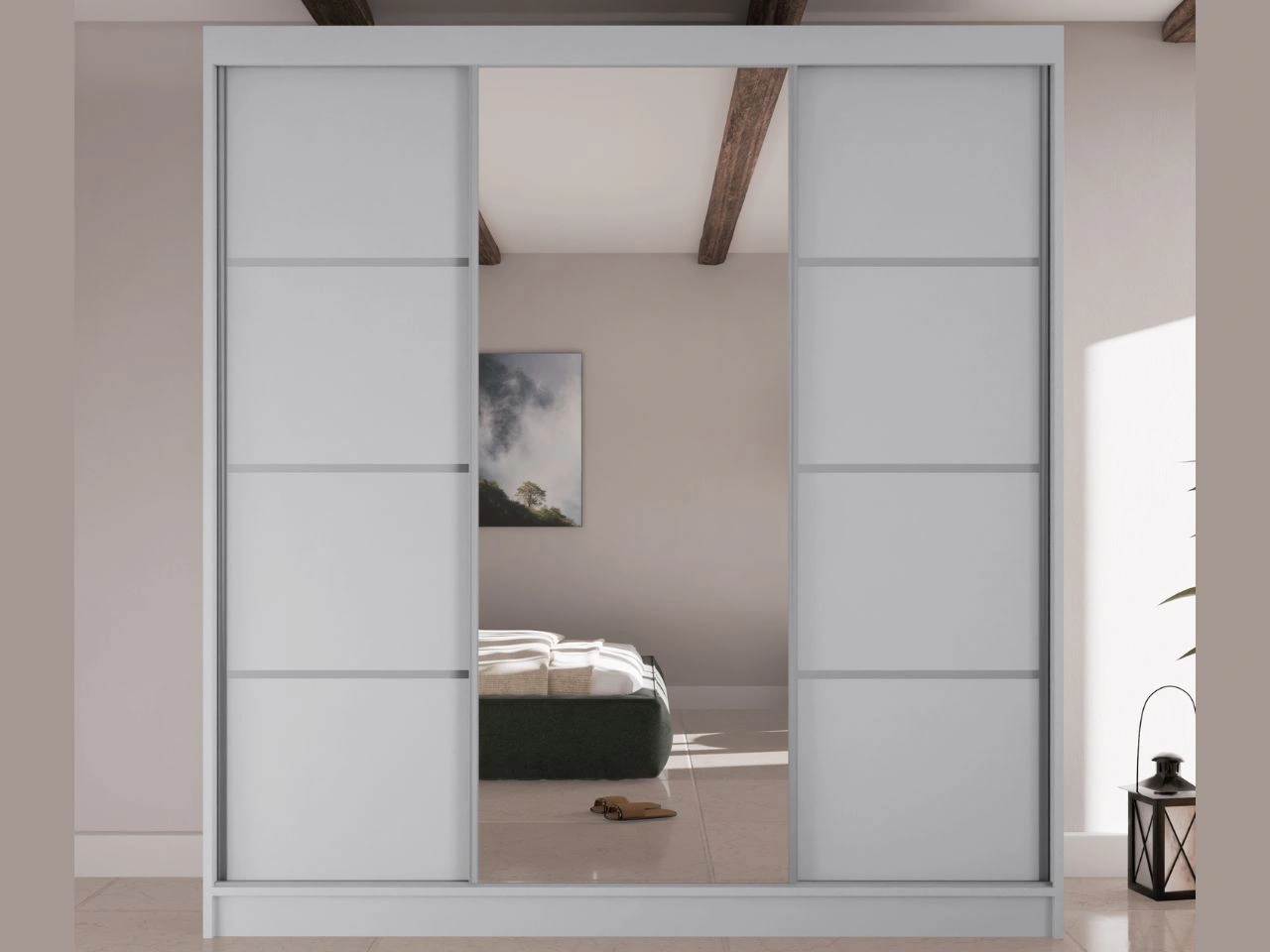 Szafa przesuwna Vello to nowoczesny i uniwersalny mebel do sypialni, garderoby lub przedpokoju. Prosta, minimalistyczna bryła z gładkimi frontami i centralnym lustrem nadaje wnętrzu elegancki charakter oraz optycznie powiększa przestrzeń, wprowadzając więcej światła do pomieszczenia.