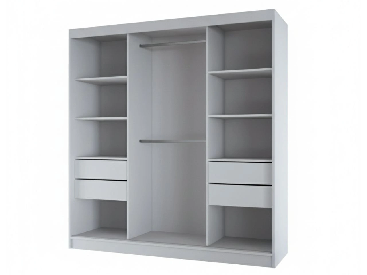 Korpus szafy wykonano z trwałej płyty laminowanej, odpornej na codzienne użytkowanie i łatwej w pielęgnacji. Zastosowany system drzwi przesuwnych oparty na aluminiowych prowadnicach, łożyskowanych kółkach typu FAST oraz prowadnicy rolkowej zapewnia płynną, stabilną i cichą pracę frontów.