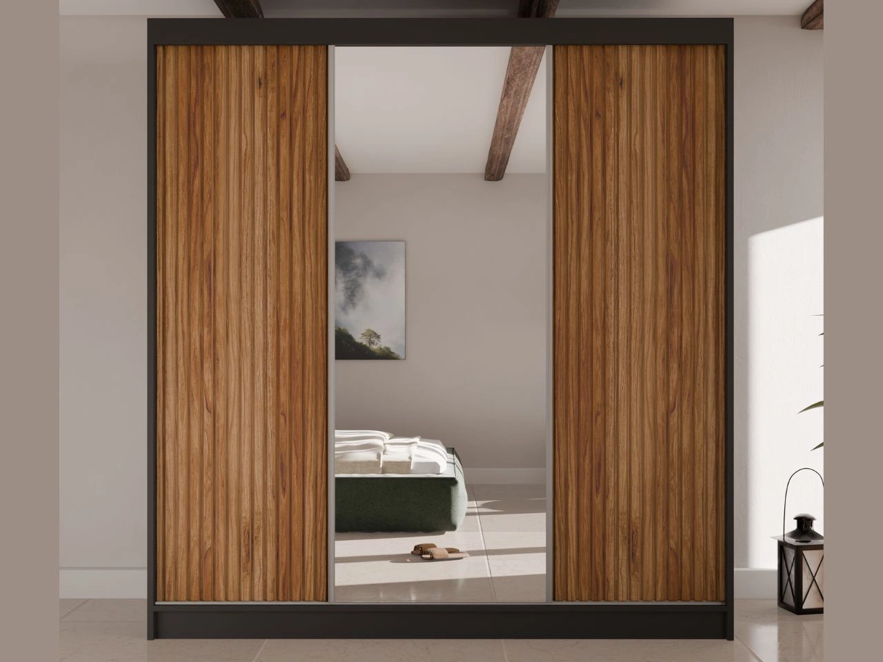Szafa przesuwna z ryflowanym frontem i lustrem 200 cm Rivas Czarna, Catania