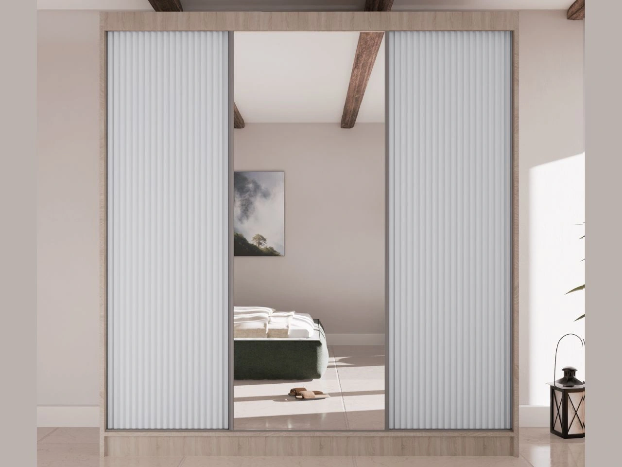 Szafa przesuwna z ryflowanym frontem i lustrem 200 cm Rivas Dąb Sonoma, Biała