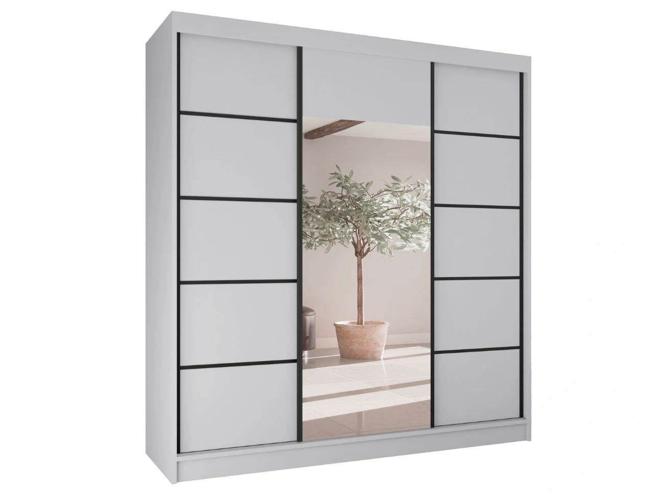 Szafa przesuwna Maia to nowoczesny i elegancki mebel zaprojektowany do sypialni, garderoby lub przedpokoju. Prosta, geometryczna bryła z gładkimi frontami została uzupełniona o centralnie umieszczone lustro, które subtelnie rozjaśnia wnętrze i optycznie je powiększa, nie dominując przy tym całej bryły.