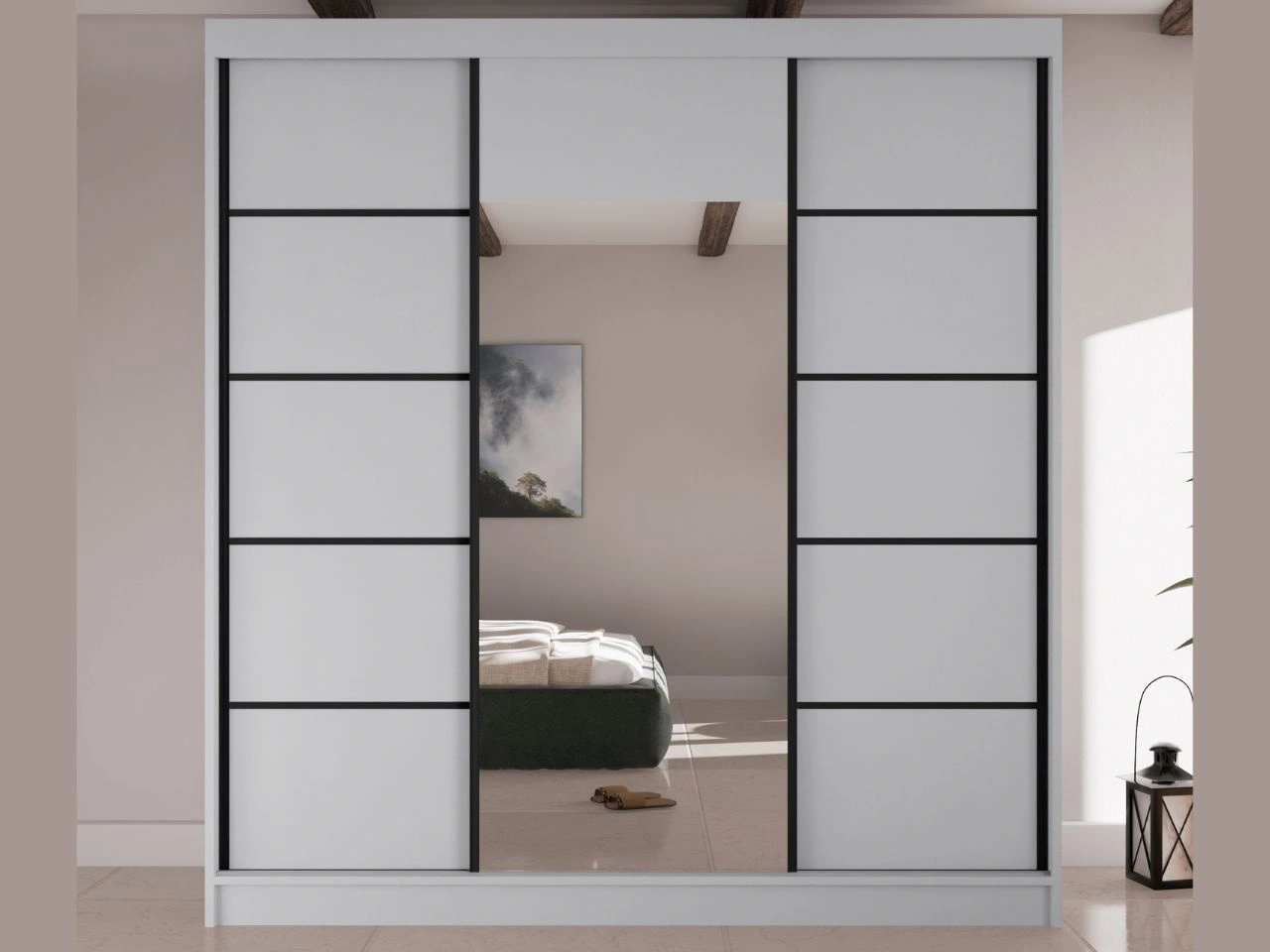 - Czarne, dekoracyjne szprosy w systemie przesuwnym akcentują podziały frontów i nadają szafie elegancki, nowoczesny charakter