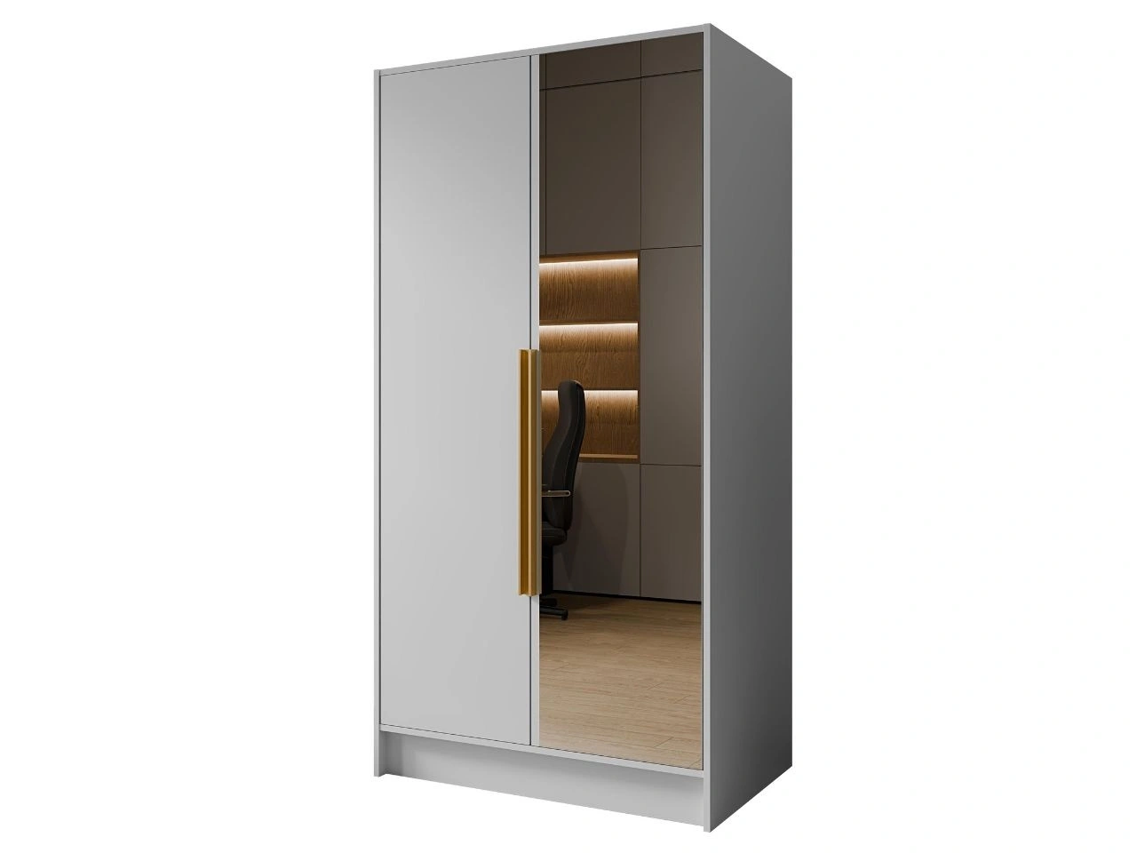 Szafa Lucca to nowoczesny i elegancki mebel zaprojektowany z myślą o minimalistycznych, funkcjonalnych wnętrzach sypialni, garderoby lub domowego biura. Prosta, geometryczna bryła z gładkimi frontami oraz lustrem nadaje całości lekkości, a jednocześnie optycznie powiększa przestrzeń i doświetla wnętrze.