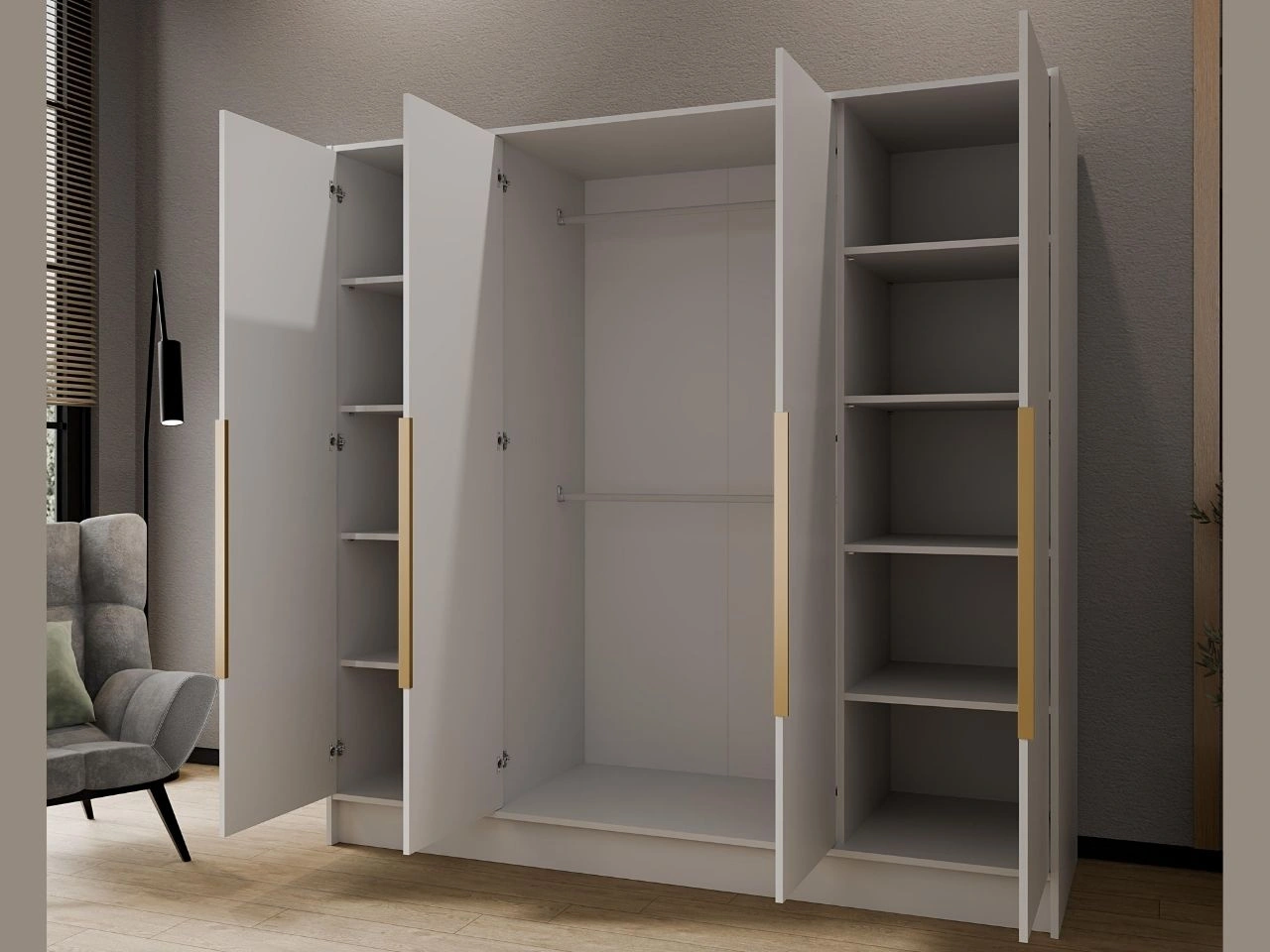 Fronty wyposażono w eleganckie uchwyty, które stanowią wyrazisty, nowoczesny akcent wizualny. Ich smukła forma podkreśla pionowe linie bryły, ułatwia komfortowe otwieranie drzwi i harmonijnie komponuje się z minimalistycznym charakterem szafy.