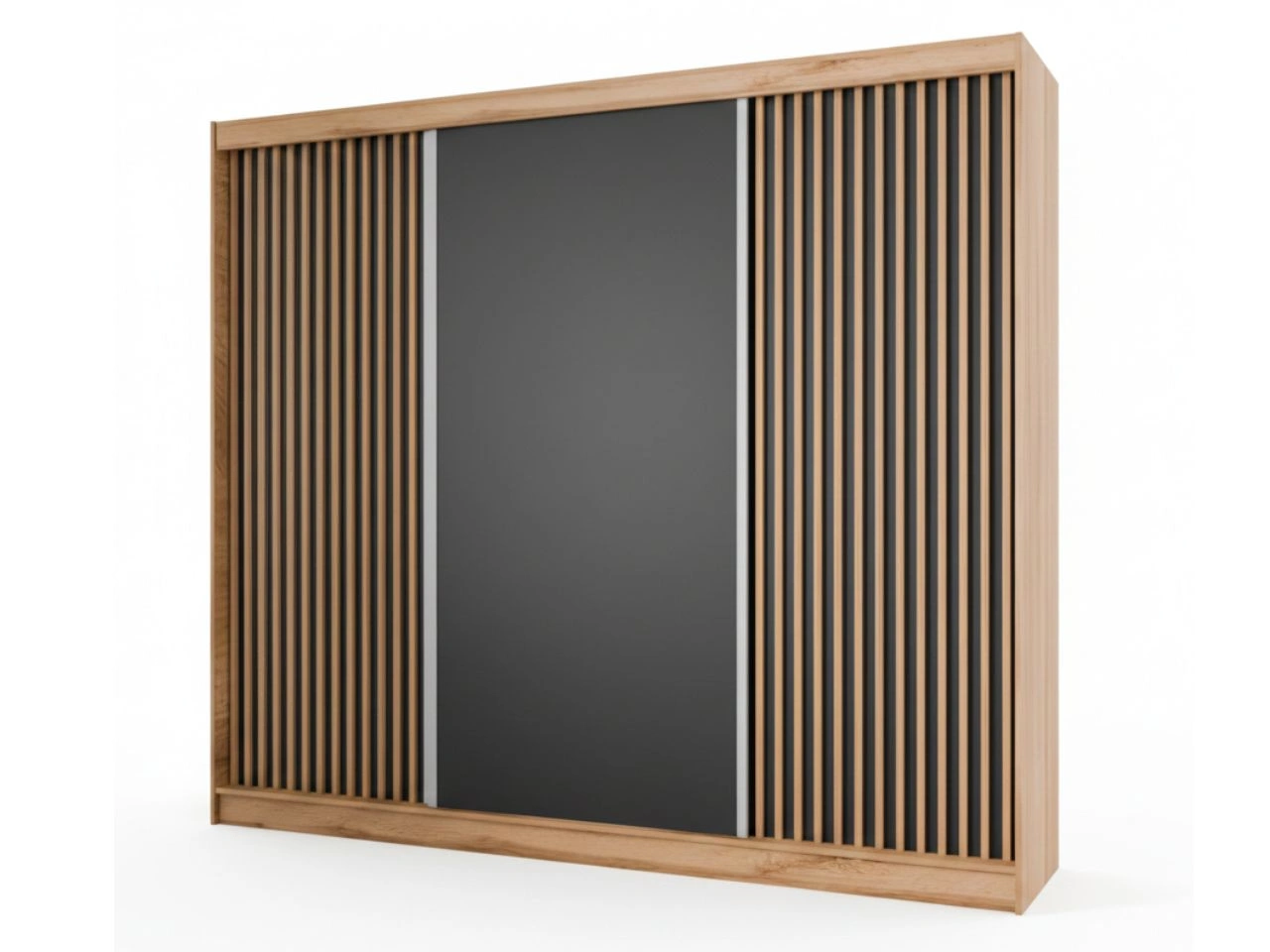 Szafa przesuwna Loreto to nowoczesna i funkcjonalna propozycja dla osób, które szukają pojemnej szafy do sypialni, garderoby lub przedpokoju, a jednocześnie zależy im na estetycznym, dopracowanym wyglądzie. Trzy przesuwne fronty, z czego dwa zdobią lamele w kolorze dąb wotan, nadające szafie elegancki, nowoczesny charakter.