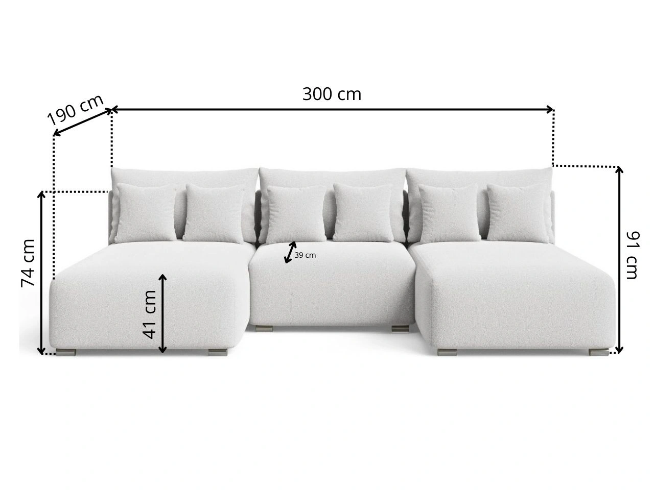 • Głębokość siedziska do poduszek: 39 cm