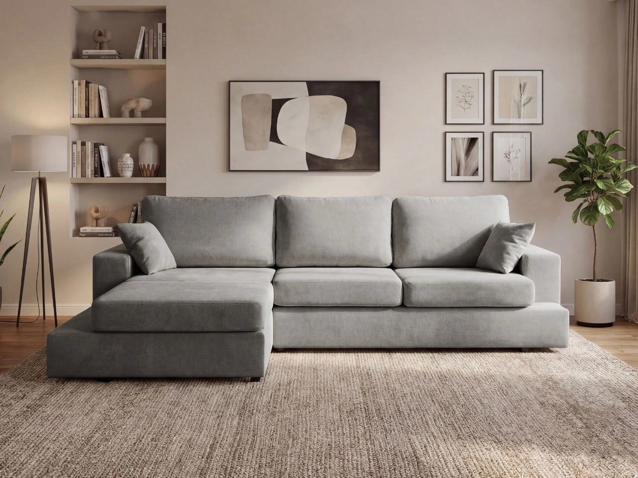 Ten nowoczesny narożnik w kształcie L jest wolnostojący z tapicerowanym tyłem, dzięki czemu może stanąć w dowolnym miejscu salonu, nie tracąc na estetyce. Model posiada już zamontowane czarne nóżki z tworzywa sztucznego, które subtelnie unoszą mebel nad podłogą i podkreślają jego nowoczesny charakter. Stylowy, komfortowy i funkcjonalny – kanapa narożna to propozycja dla każdego, kto szuka eleganckiego tapicerowanego narożnika do salonu, który w pełni wykorzysta przestrzeń i zapewni wygodę codziennego użytkowania.