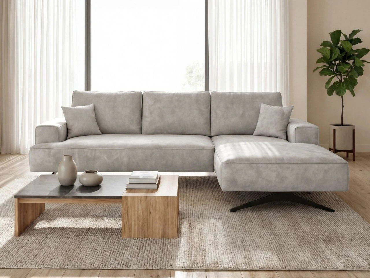 Narożnik Leto to nowoczesny mebel zaprojektowany z myślą o wygodzie i funkcjonalności w salonie. Jego geometryczna forma w połączeniu z czarnymi nogami typu płozy nadaje wnętrzu elegancji i przestronności, a podwyższona konstrukcja ułatwia utrzymanie czystości pod meblem.